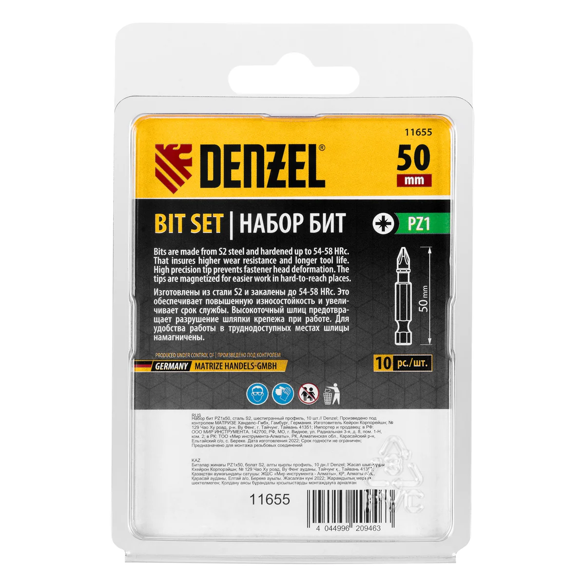 Набор бит PZ1 х 50 мм Denzel 11655 включает в себя 10 насадок из стали S2 с хвостовиком 1/4"", рассчитанных на работу с шуруповертом. Оснастка служит для монтажа и демонтажа шурупов, саморезов и других резьбовых соединений. Шлиц PZ имеет 4 дополнительных ребра, за счет чего предотвращается проскальзывание биты в крепеже, повышаются точность и эффективность работ. Удлиненное до 50 мм основание облегчает работу в труднодоступных местах.ПреимуществаУстойчивость к деформации при высоких нагрузках — биты изготовлены из японской легированной стали S2 и закалены до твердости 60 HRC.Высокоточное исполнение — оптимальная геометрия шлица и максимальный контроль на производстве в Тайване позволили добиться выверенности каждой биты и предотвратить проскальзывание рабочей части в головке крепежа.Удобная эксплуатация — намагниченный шлиц облегчает работу и позволяет направлять шуруповерт с насаженным крепежом одной рукой, а другой придерживать закрепляемую деталь.Антикоррозионные свойства — никелированное покрытие увеличивает срок службы насадок.Защита от подделок — цветное кольцо с логотипом ТМ Denzel на каждой бите подтверждает оригинальность товара.10 бит в комплекте — набора хватит на целую бригаду.Удобная упаковка — набор поставляется в двойном блистере с европодвесом.