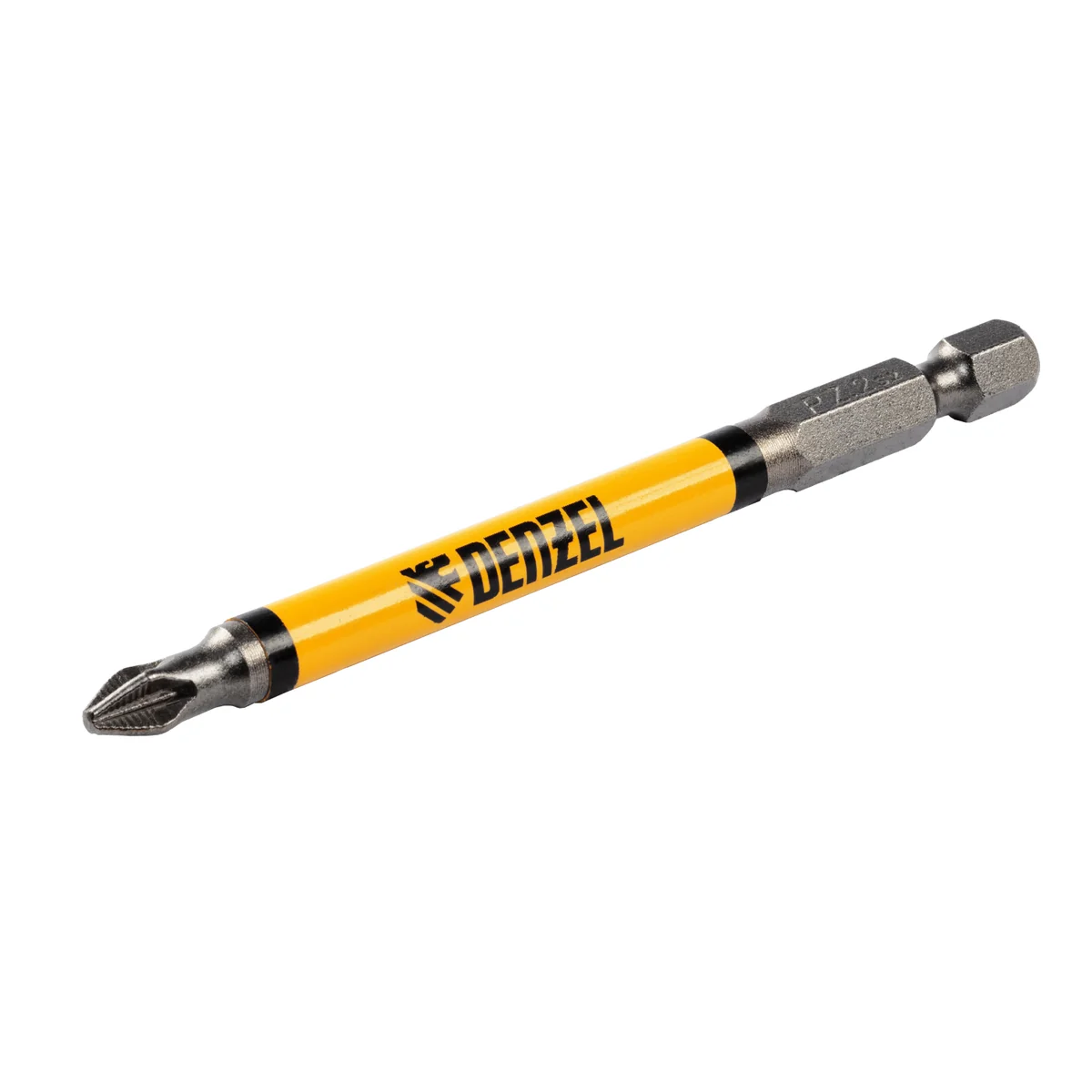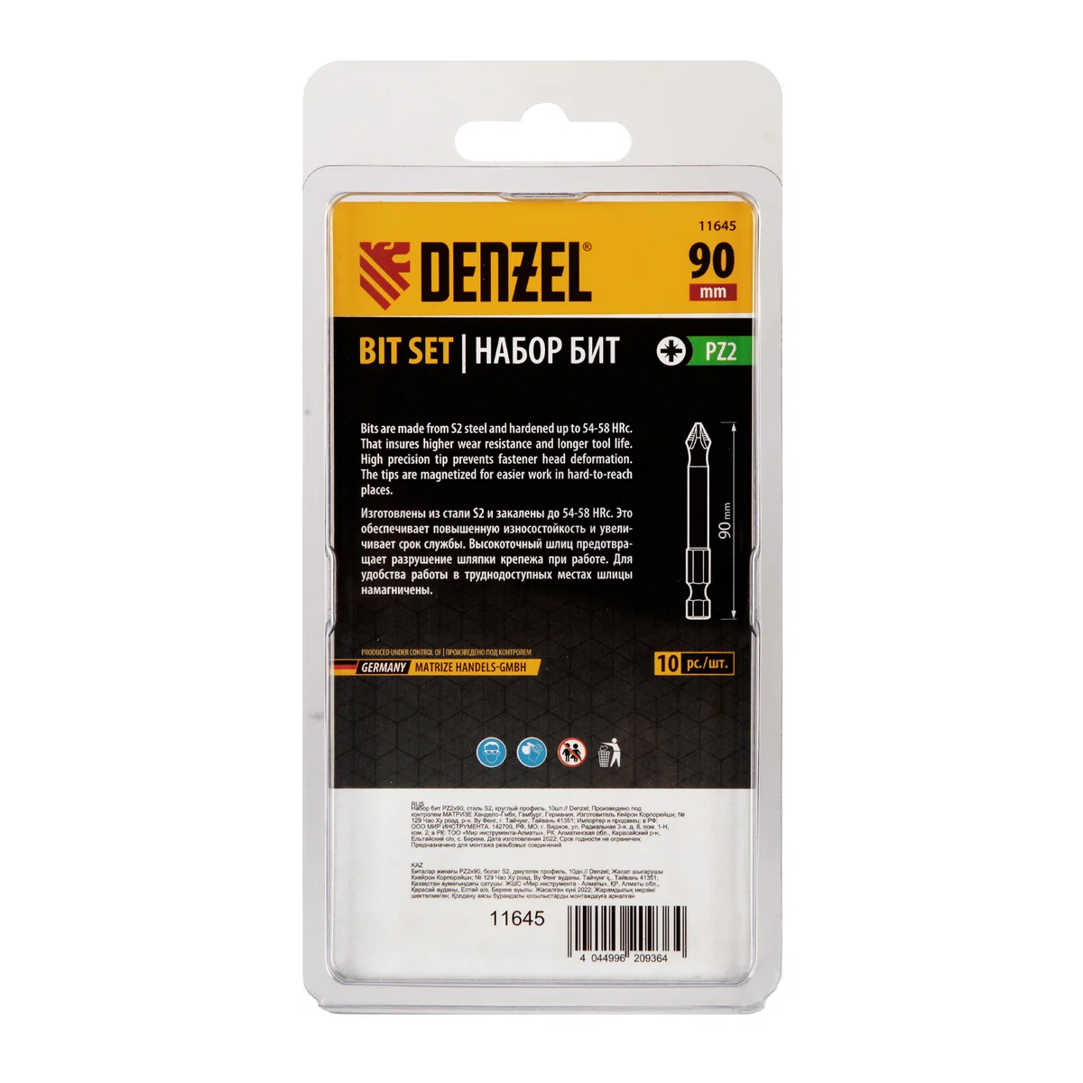 Набор односторонних бит PZ x 90 мм Denzel 11645 включает в себя 10 сменных насадок из стали S2 с крестообразными шлицами Pozidriv и шестигранными хвостовиками 1/4"". Профессиональная оснастка рассчитана на работу с шуруповертом, обеспечивает быстрый монтаж и демонтаж резьбовых соединений с углублением PZ2. Устойчивое сцепление с крепежом благодаря дополнительным ребрам на шлице Позидрайв позволяет увеличить крутящий момент и снизить риск соскакивания биты.ПреимуществаДолговечность — насечки на шлице препятствуют проскальзыванию и «слизыванию» бит, дополнительно усиливают контроль при работе с саморезами по дереву.Высокая результативность даже в ограниченном пространстве — благодаря удлиненному до 90 мм профилю битами удобно работать в труднодоступных местах.Устойчивость к деформации при больших нагрузках — биты изготовлены из японской легированной стали S2 повышенной прочности и закалены до твердости 60 HRC.Намагниченный шлиц облегчает работу — крепеж удерживается битой, поэтому свободной рукой можно придерживать закрепляемую поверхность.Антикоррозионные свойства — никелированное покрытие увеличивает срок службы насадок.10 бит в комплекте — набора хватит на целую бригаду.Удобная упаковка — оснастка поставляется в двойном блистере с европодвесом.