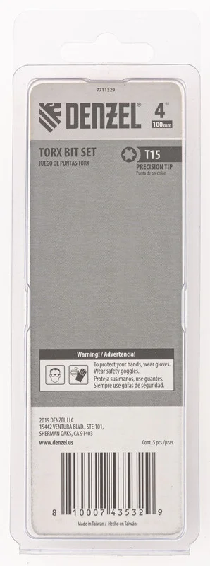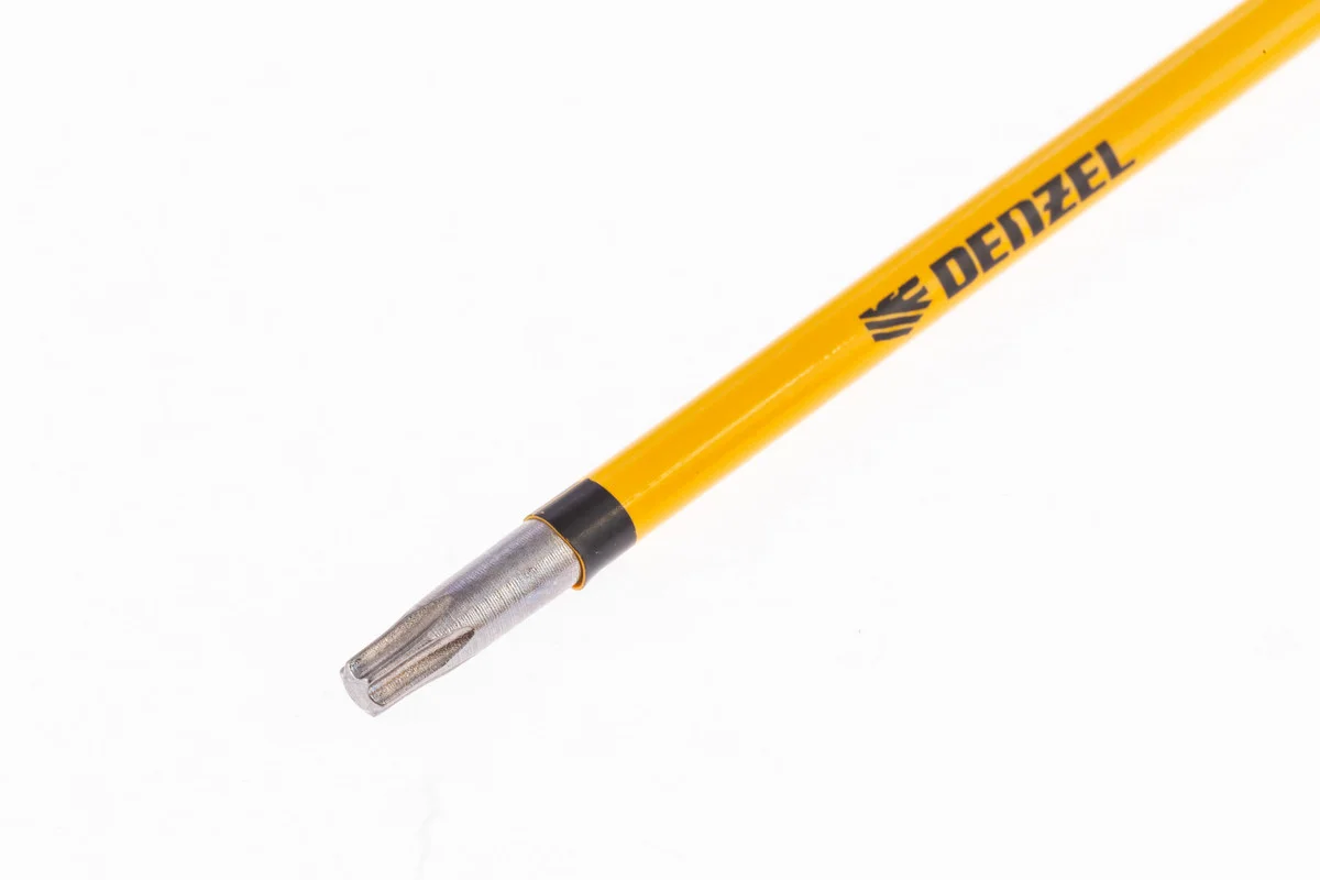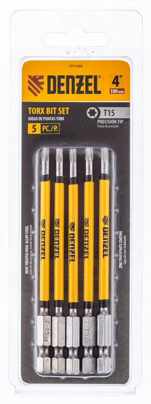 Набор бит TORX 20 х 50 мм Denzel включает в себя 5 насадок с хвостовиками 1/4 дюйма из стали S2 для работы с шуруповертами. Шлиц в форме звезды служит для быстрого монтажа и демонтажа винтов при сборке бытовой техники и электроприборов. Набор универсален и подходит как для бытового, так и для профессионального применения. Благодаря конструктивной особенности лучи «звезды» надежно сцепляются с крепежом, нагрузка равномерно распределяется на все грани, это снижает риск соскальзывания биты и обеспечивает высокую точность работ.ПреимуществаДолговечность и надежность — биты сделаны из японской легированной стали S2 твердостью 54-58 HRC, что повышает их износостойкость и увеличивает срок службы.Высокое качество — точное исполнение шлица и максимальный контроль качества на производстве в Тайване позволяют добиться выверенности каждой биты и предотвратить проскальзывание рабочей части в головке крепежа.Удобная работа — намагниченный шлиц позволяет направлять шуруповерт с насаженным крепежом одной рукой, а другой придерживать закрепляемую деталь.Антикоррозионные свойства — защитное никелированное покрытие продлевает срок службы насадок.Каждая бита защищена от подделок — об этом свидетельствует цветное кольцо с логотипом ТМ Denzel.Удобное хранение — оснастка поставляется в жестком блистере с европодвесом.Большой запас — набора из 5 штук достаточно для снабжения бригады работников.