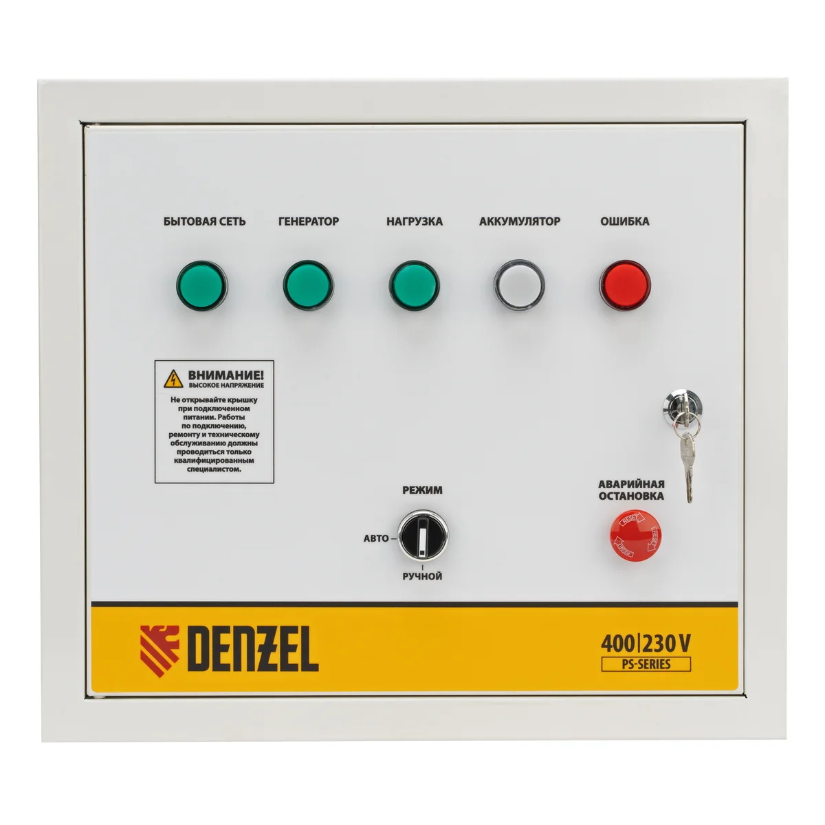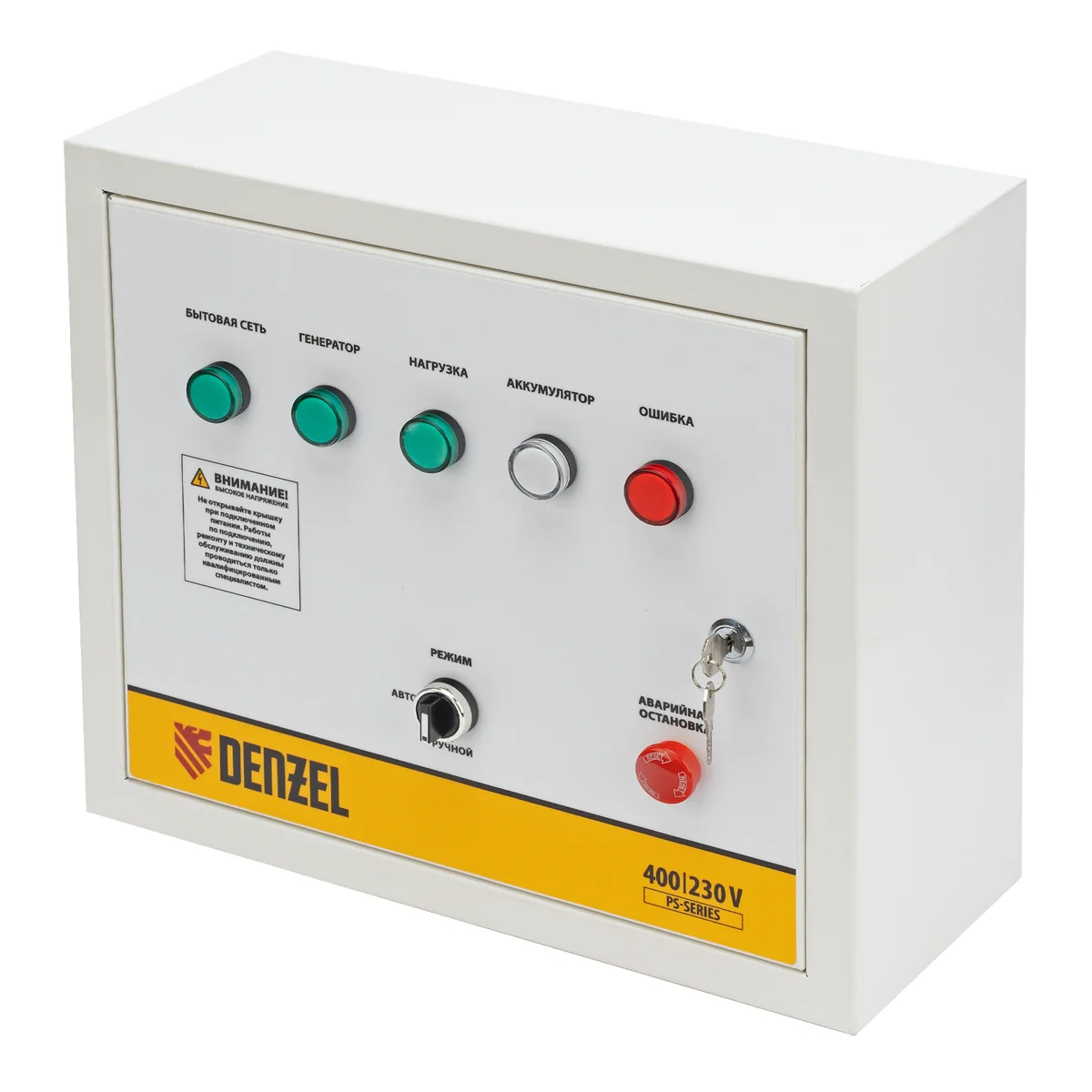 Блок автоматического запуска Denzel PS-180TS 946716 используется совместно с генератором PS-180EA или PS-180EAD-3. Позволяет создать систему автономного электроснабжения. Блок управления переключает питание на генератор при падении напряжения в стационарной сети, а при восстановлении электроснабжения останавливает генератор и переключает питание объекта обратно на сеть. Устройство рассчитано на нагрузку 20 кВА и будет полезно в загородном доме и на строительной площадке.Преимущества2 режима работы — возможен ручной или автоматический запуск генератора.Удобный контроль работы — на лицевой панели предусмотрены индикаторы напряжения сети и генератора, подключения нагрузки, а также зарядки аккумулятора и оповещения об ошибке.Безопасность — дверца блока управления закрывается на ключ для предотвращения несанкционированного доступа к электрическим выводам.Бесперебойная работа — зарядка аккумулятора происходит автоматически.Подтвержденное качество — производитель предоставляет 3-летнюю гарантию на заводской брак.