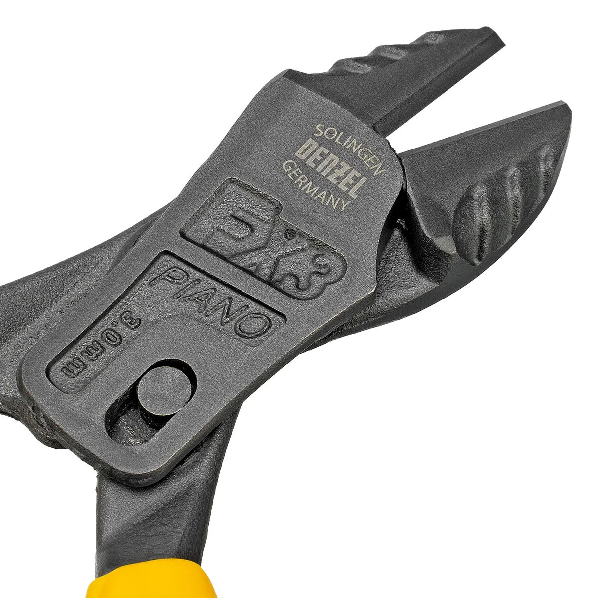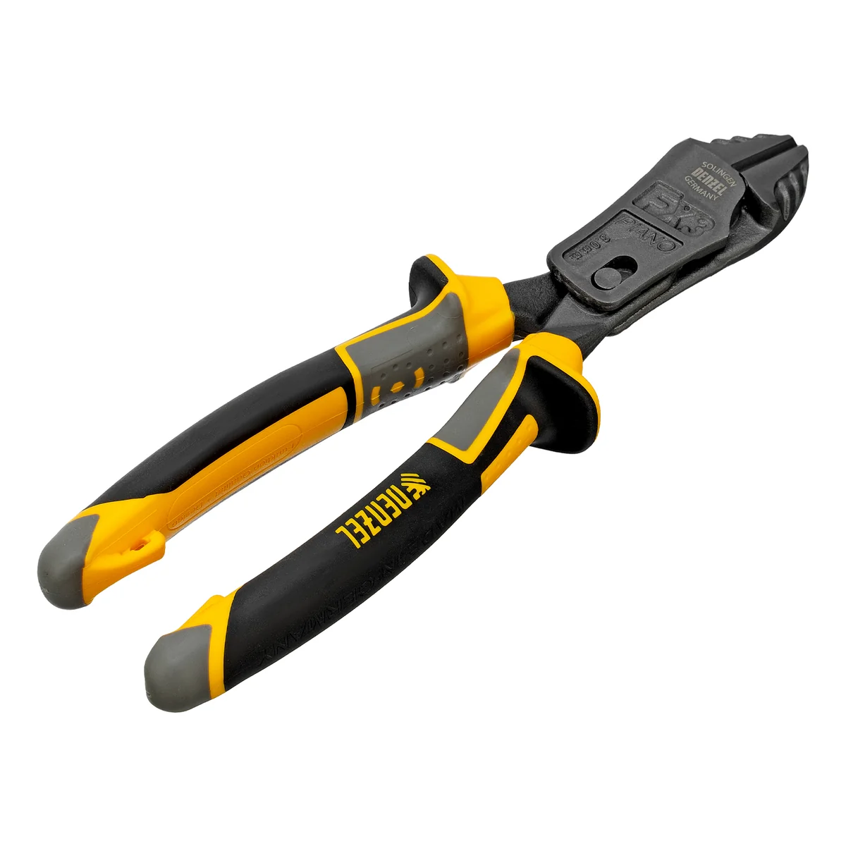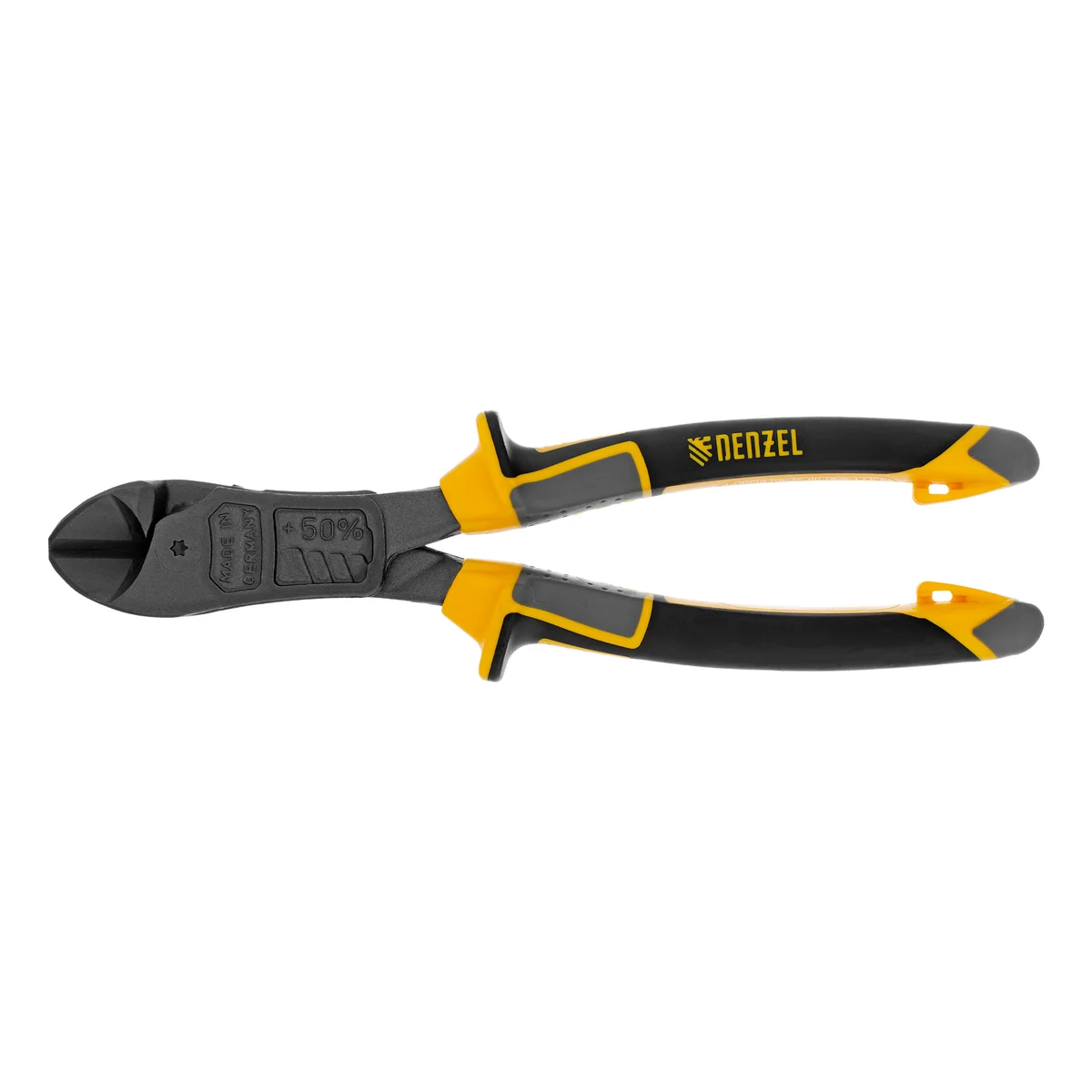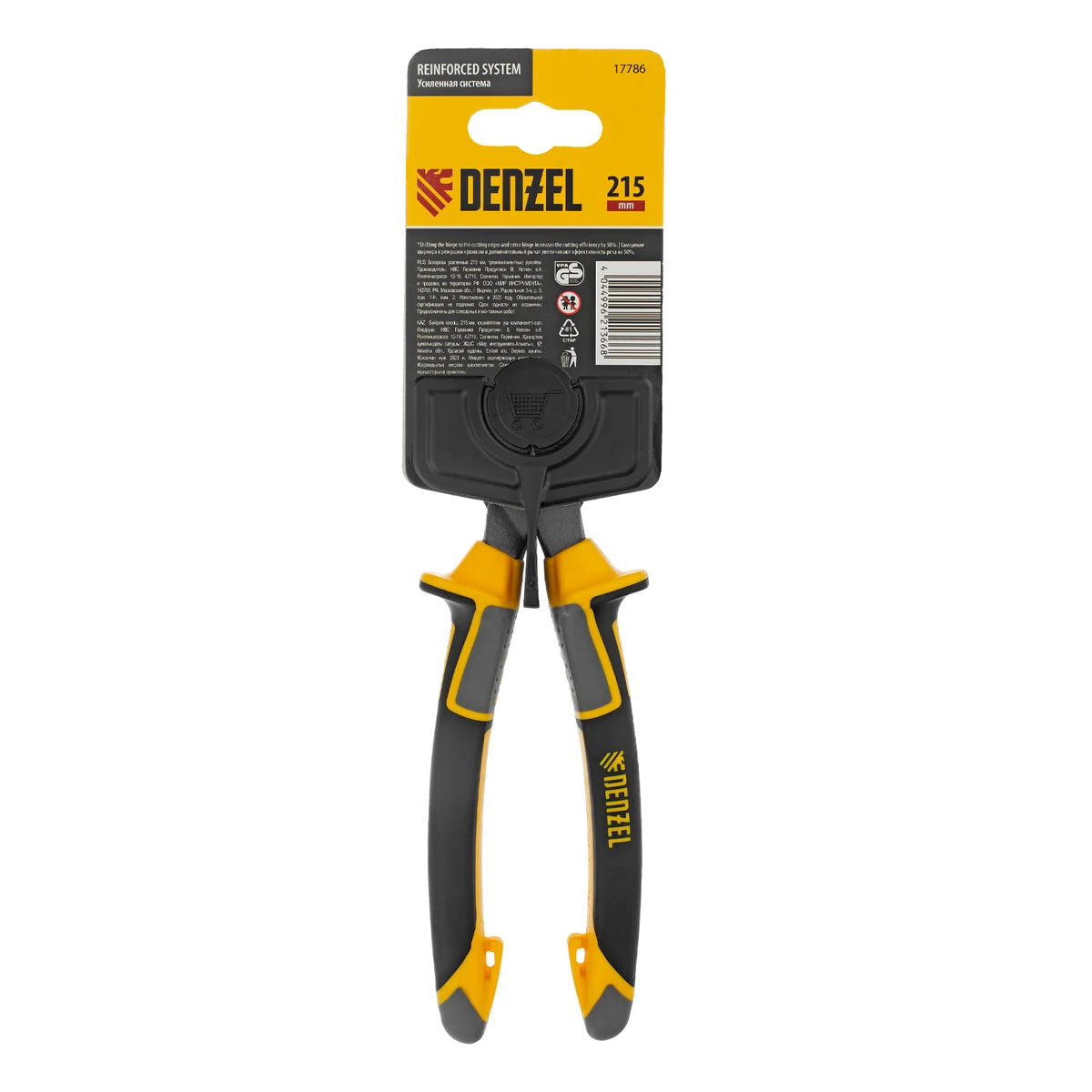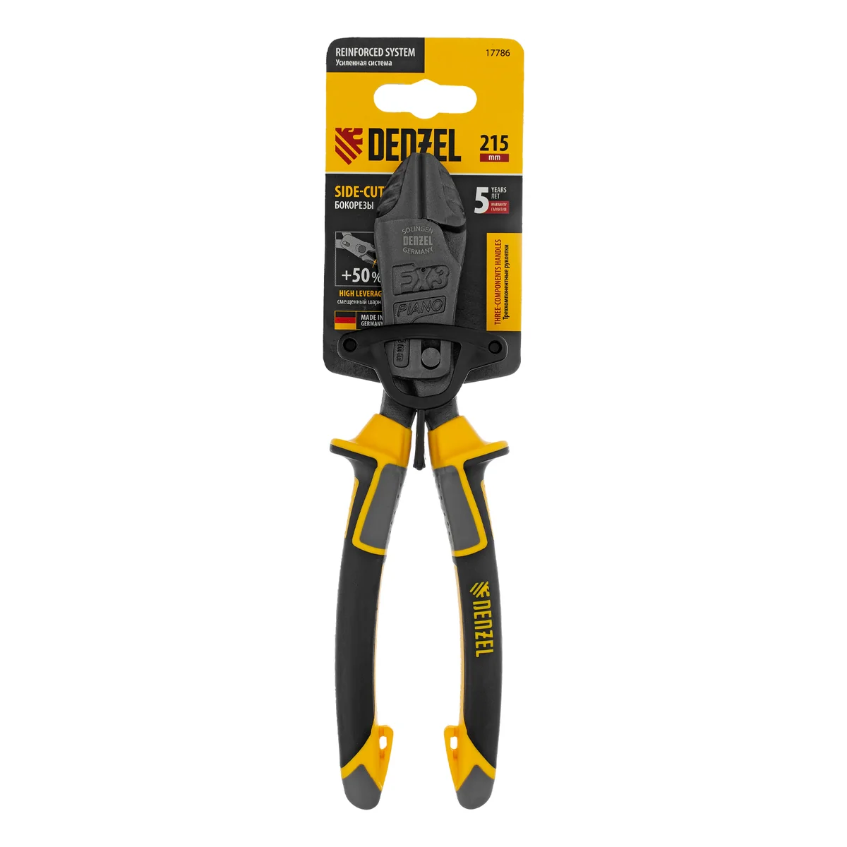 Усиленные бокорезы Denzel 17786 длиной 215 мм, с трехкомпонентными рукоятками, предназначены для разрезания кабелей, проводов, проволоки, рояльных струн и т.д. Успешно справляются не только с медными, алюминиевыми и пластмассовыми деталями, но и с более жесткими стальными элементами диаметром до 3,5 мм. Встроенный рычажный механизм и смещенный непосредственно к режущим кромкам шарнир увеличивают усилие реза на 50%.