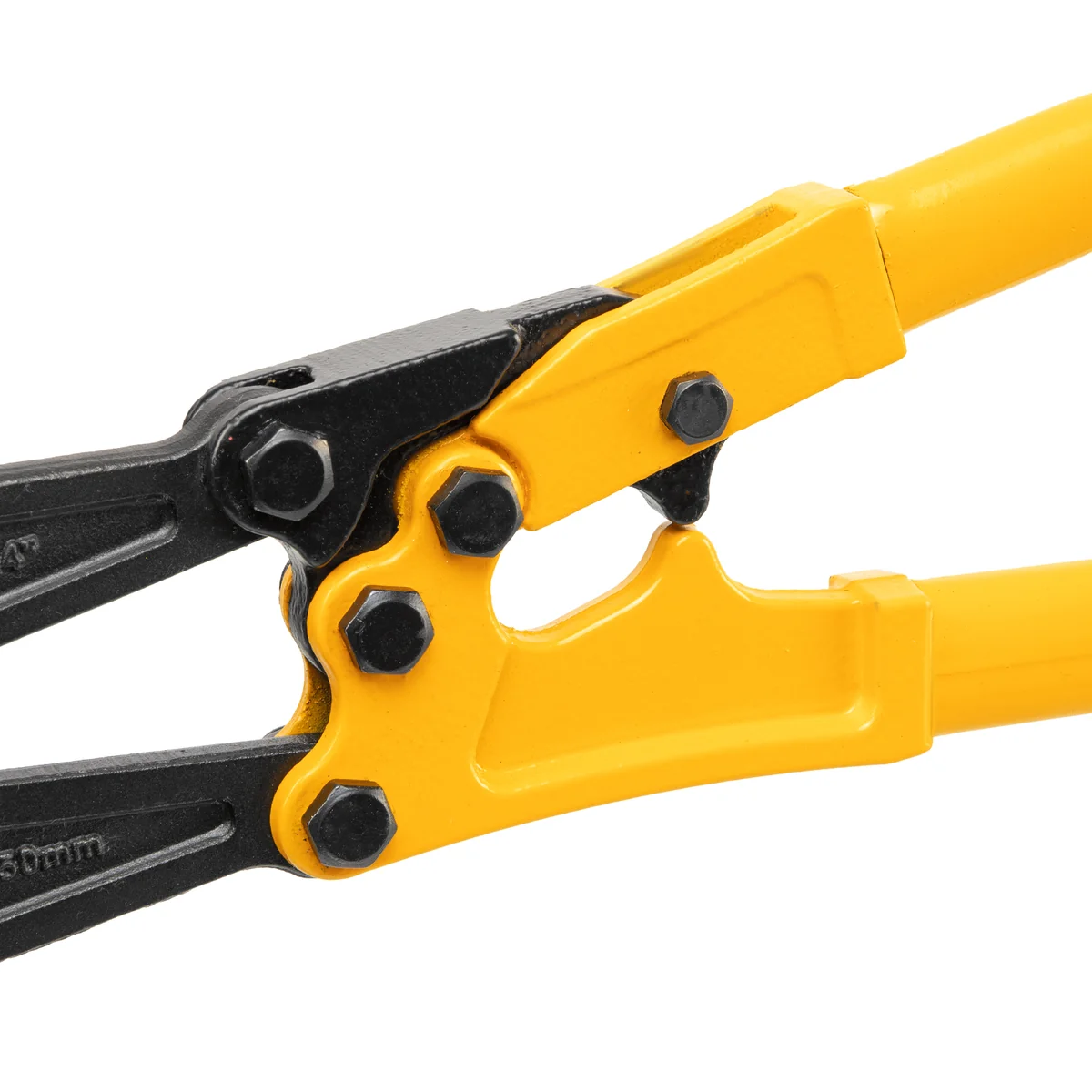 Болторез Denzel 78533 длиной 350 мм (14 дюймов), из стали Cr-Mo, предназначен для перекусывания стальных прутков диаметром 6,4 мм, болтов и шурупов, разнородной проволоки.Преимущества Износостойкие губки, выполненные из стали CrMo, обладают повышенной прочностью и жесткостью. Твердость рабочих губок 56-60 HRC позволяет работать с прочными материалами. Дополнительный рычаг уменьшает прикладываемое усилие. Эксцентриковый механизм регулирует прилегание рабочих губок друг к другу. Эргономичные рукоятки удобно лежат в руке.