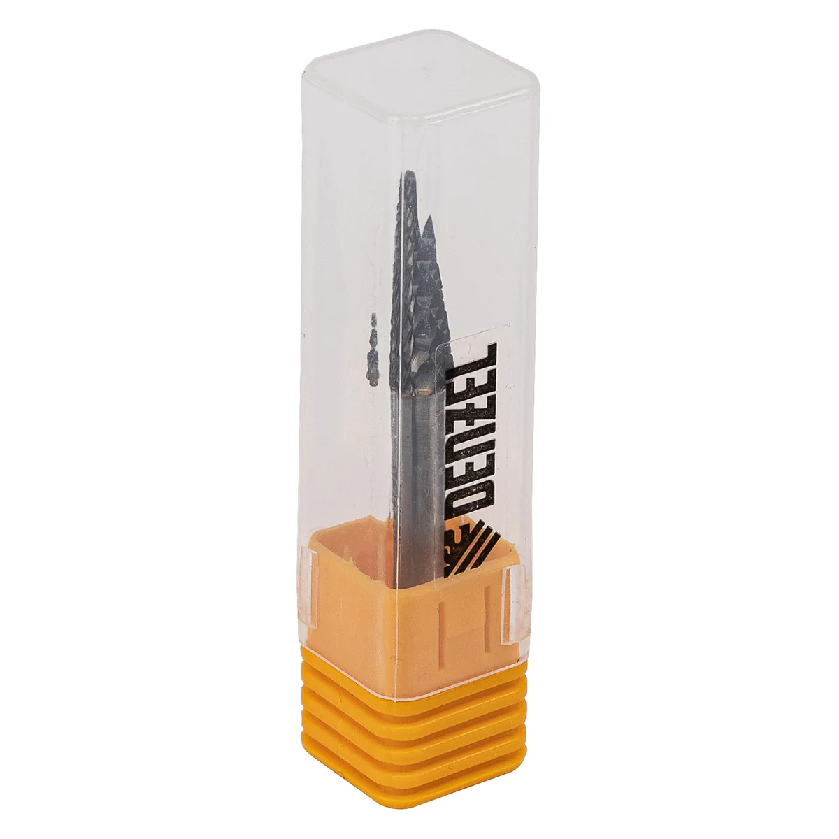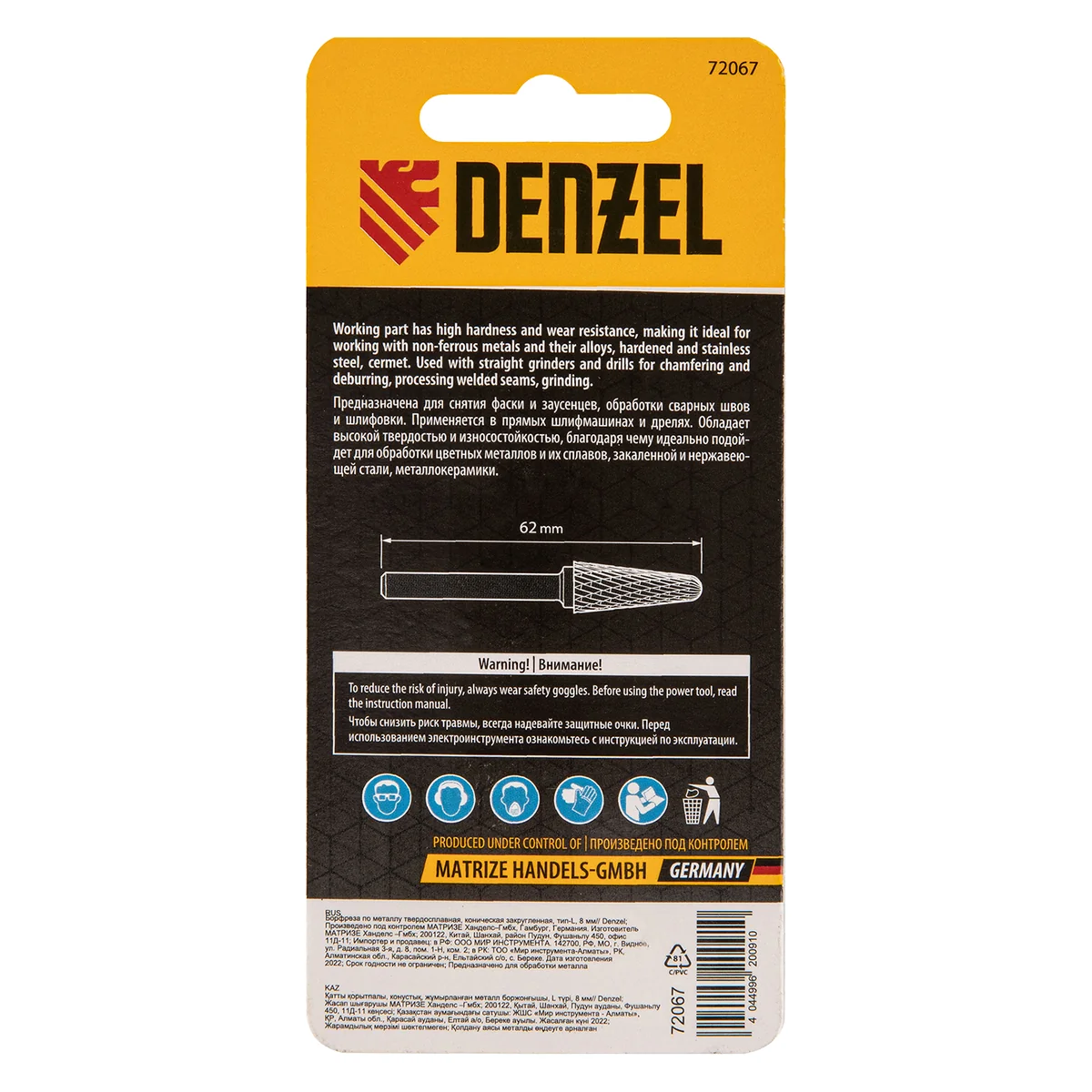 Борфреза Denzel 72067 применяется в прямых шлифмашинах и дрелях для работы с нержавеющей сталью, латунью, медью, чугуном, бронзой, титаном. Предназначена для завершающей обработки и подгонки форм и поверхностей снятия фаски и заусенцев, обработки сварных швов, шлифовки.Преимущества- Твердосплавная рабоачая часть из сплава ВК8 с твердостью 88-92 HRC позволяет работать с особо прочными материалами.- Специальные перекрестные насечки-стружколомы обеспечивают облегченное удаление стружки, повышая скорость и эффективность работы- Цилиндрический хвоствоик совместим со всеми типами патронов- Практичный пластиковый кейс для удобного хранения