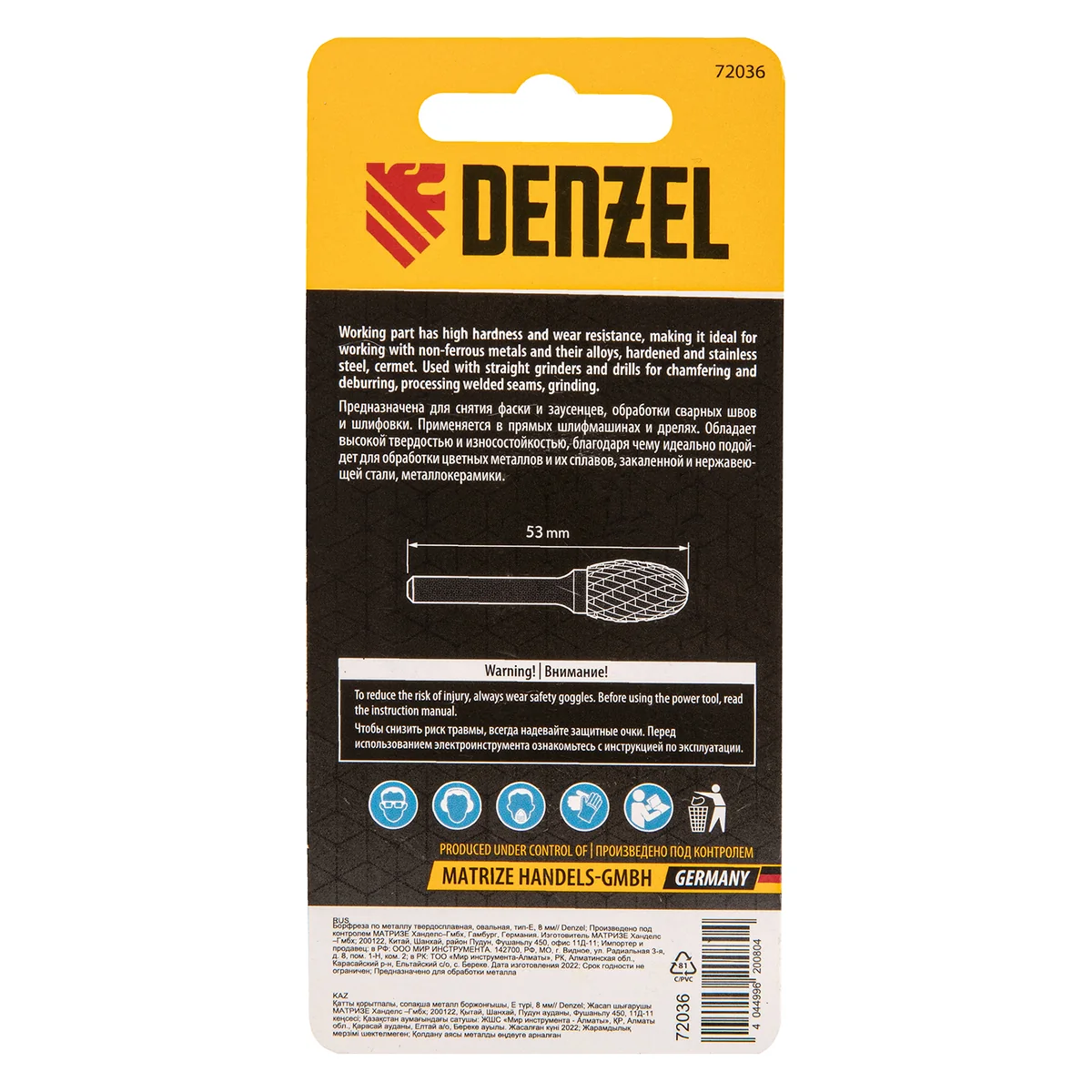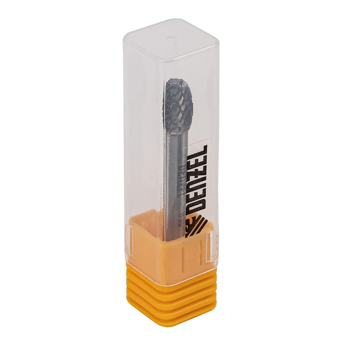Борфреза Denzel 72036 применяется в прямых шлифмашинах и дрелях для работы с нержавеющей сталью, латунью, медью, чугуном, бронзой, титаном. Предназначена для завершающей обработки и подгонки форм и поверхностей снятия фаски и заусенцев, обработки сварных швов, шлифовки.Преимущества- Твердосплавная рабоачая часть из сплава ВК8 с твердостью 88-92 HRC позволяет работать с особо прочными материалами.- Специальные перекрестные насечки-стружколомы обеспечивают облегченное удаление стружки, повышая скорость и эффективность работы- Цилиндрический хвоствоик совместим со всеми типами патронов- Практичный пластиковый кейс для удобного хранения