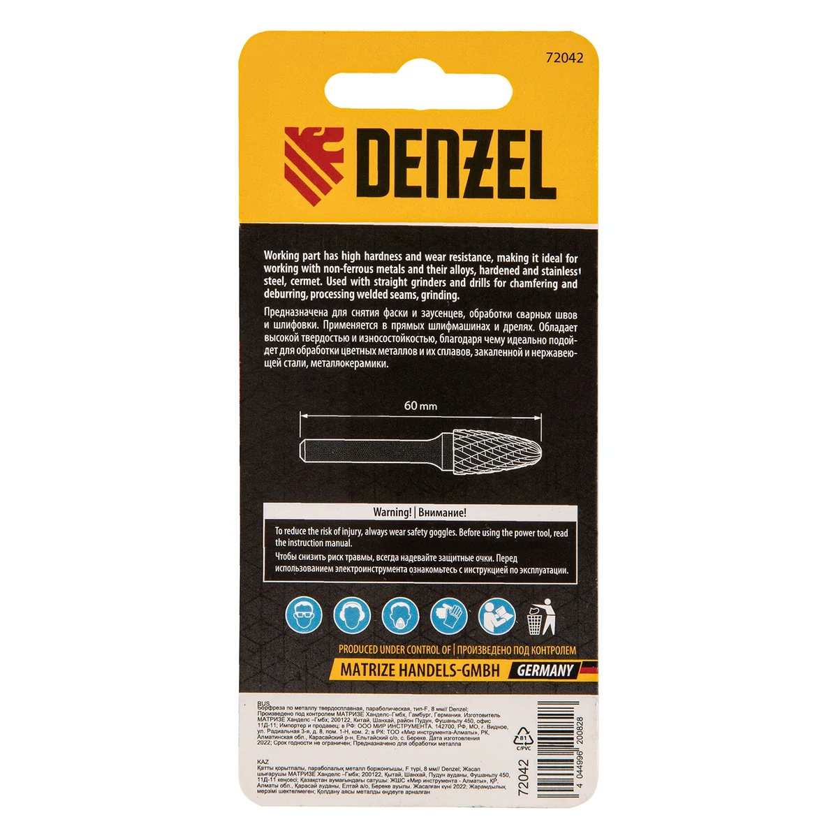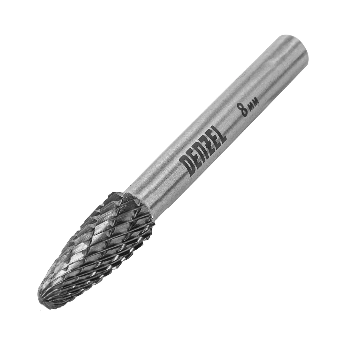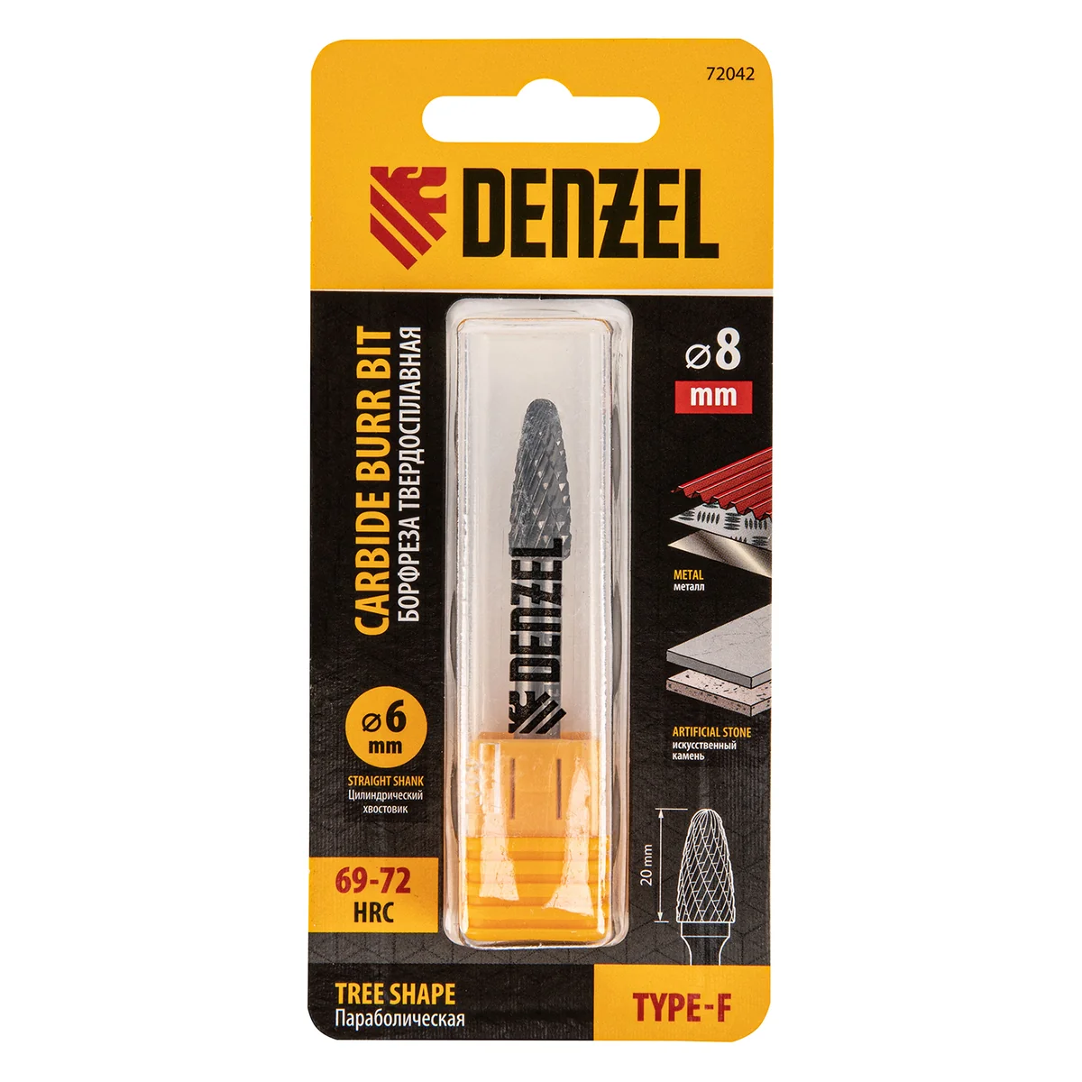 Борфреза Denzel 72042 применяется в прямых шлифмашинах и дрелях для работы с нержавеющей сталью, латунью, медью, чугуном, бронзой, титаном. Предназначена для завершающей обработки и подгонки форм и поверхностей снятия фаски и заусенцев, обработки сварных швов, шлифовки.Преимущества- Твердосплавная рабоачая часть из сплава ВК8 с твердостью 88-92 HRC позволяет работать с особо прочными материалами.- Специальные перекрестные насечки-стружколомы обеспечивают облегченное удаление стружки, повышая скорость и эффективность работы- Цилиндрический хвоствоик совместим со всеми типами патронов- Практичный пластиковый кейс для удобного хранения