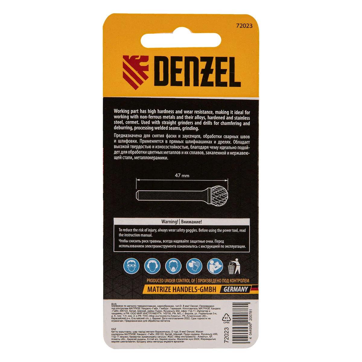Борфреза Denzel 72023 применяется в прямых шлифмашинах и дрелях для работы с нержавеющей сталью, латунью, медью, чугуном, бронзой, титаном. Предназначена для завершающей обработки и подгонки форм и поверхностей снятия фаски и заусенцев, обработки сварных швов, шлифовки.Преимущества- Твердосплавная рабоачая часть из сплава ВК8 с твердостью 88-92 HRC позволяет работать с особо прочными материалами.- Специальные перекрестные насечки-стружколомы обеспечивают облегченное удаление стружки, повышая скорость и эффективность работы- Цилиндрический хвоствоик совместим со всеми типами патронов- Практичный пластиковый кейс для удобного хранения