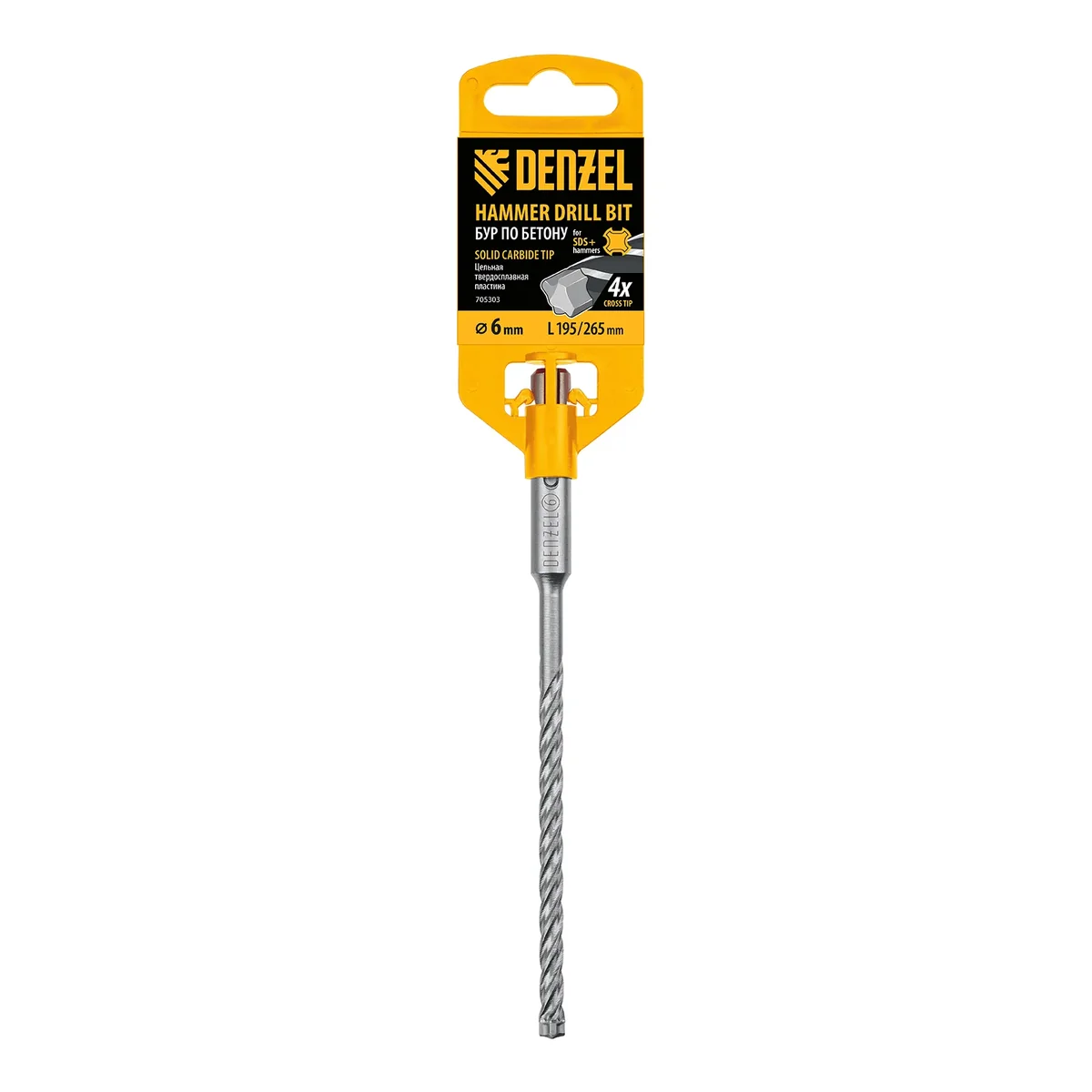 Бур по бетону, цельная крестовая пластина, 6x265 мм, SDS PLUS Denzel 705303