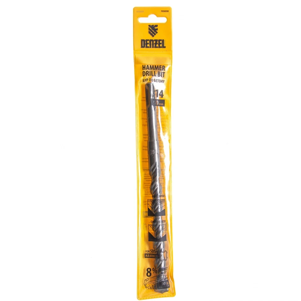 Бур по бетону Denzel арт. 705030 с хвостовиком SDS PLUS и двойной спиралью предназначен для сверления отверстий в бетоне, кирпиче и камне. Он используется в качестве оснастки для перфораторов с патроном SDS Plus. Бур оптимален для проведения строительных, ремонтных, монтажных работ.ПреимуществаВысокий ресурс — режущая твердосплавная пластина из стали ВК8 твердостью 80-90 HRC с W-образной заточкой способна сверлить отверстия до 30% быстрее, в том числе при работе с камнем.Прочность и износостойкость — рабочая часть из легированной стали 40Х выдерживает интенсивные и длительные ударные нагрузки, а также делает бур самым высокопроизводительным среди аналогов средней цены.Двойная спираль и канавка с дополнительным желобом — за счет более эффективного отвода шлама рабочая часть не перегревается, что позволяет продлить срок службы бура.Удобная упаковка с европодвесом — оснастку можно разместить на стенде.