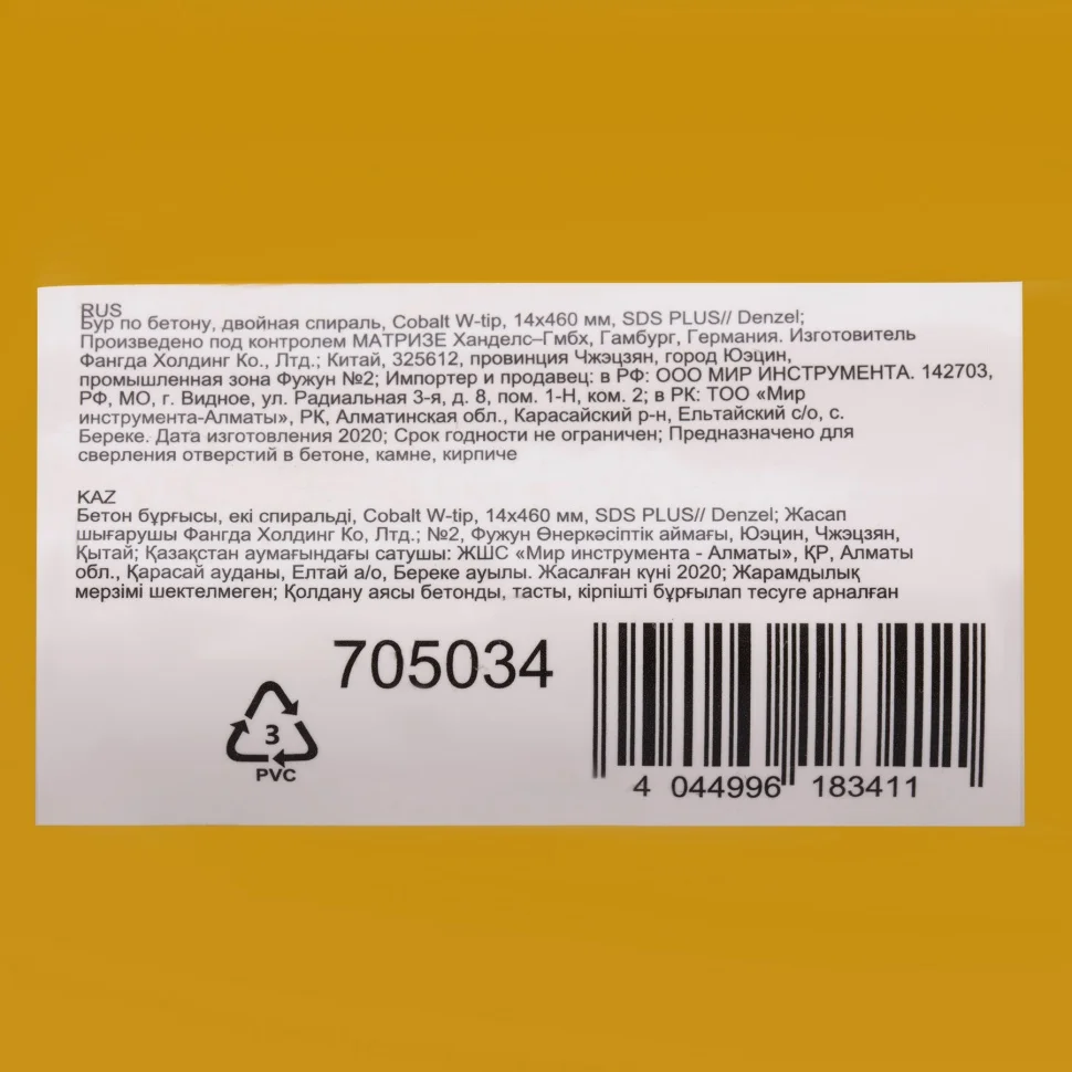 Бур по бетону Denzel арт. 705034 с хвостовиком SDS PLUS и двойной спиралью предназначен для сверления отверстий в бетоне, кирпиче и камне. Он используется в качестве оснастки для перфораторов с патроном SDS Plus. Бур оптимален для проведения строительных, ремонтных, монтажных работ.ПреимуществаВысокий ресурс — режущая твердосплавная пластина из стали ВК8 твердостью 80-90 HRC с W-образной заточкой способна сверлить отверстия до 30% быстрее, в том числе при работе с камнем.Прочность и износостойкость — рабочая часть из легированной стали 40Х выдерживает интенсивные и длительные ударные нагрузки, а также делает бур самым высокопроизводительным среди аналогов средней цены.Двойная спираль и канавка с дополнительным желобом — за счет более эффективного отвода шлама рабочая часть не перегревается, что позволяет продлить срок службы бура.Удобная упаковка с европодвесом — оснастку можно разместить на стенде.