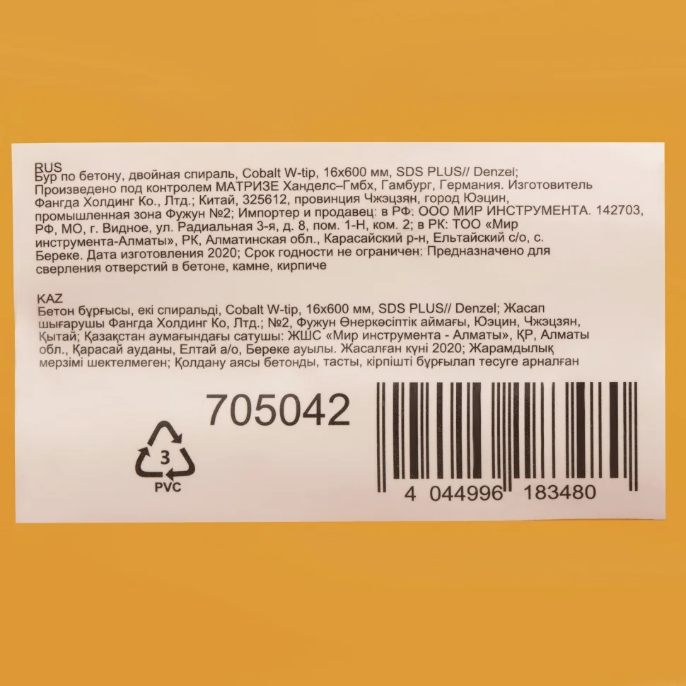 Бур по бетону Denzel арт. 705042 с хвостовиком SDS PLUS и двойной спиралью предназначен для сверления отверстий в бетоне, кирпиче и камне. Он используется в качестве оснастки для перфораторов с патроном SDS Plus. Бур оптимален для проведения строительных, ремонтных, монтажных работ.ПреимуществаВысокий ресурс — режущая твердосплавная пластина из стали ВК8 твердостью 80-90 HRC с W-образной заточкой способна сверлить отверстия до 30% быстрее, в том числе при работе с камнем.Прочность и износостойкость — рабочая часть из легированной стали 40Х выдерживает интенсивные и длительные ударные нагрузки, а также делает бур самым высокопроизводительным среди аналогов средней цены.Двойная спираль и канавка с дополнительным желобом — за счет более эффективного отвода шлама рабочая часть не перегревается, что позволяет продлить срок службы бура.Удобная упаковка с европодвесом — оснастку можно разместить на стенде.