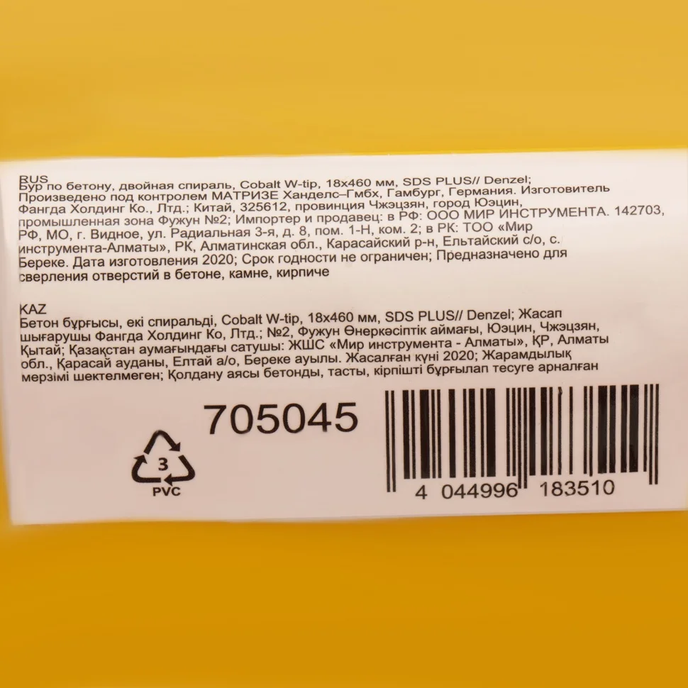 Бур по бетону Denzel арт. 705045 с хвостовиком SDS PLUS и двойной спиралью предназначен для сверления отверстий в бетоне, кирпиче и камне. Он используется в качестве оснастки для перфораторов с патроном SDS Plus. Бур оптимален для проведения строительных, ремонтных, монтажных работ.ПреимуществаВысокий ресурс — режущая твердосплавная пластина из стали ВК8 твердостью 80-90 HRC с W-образной заточкой способна сверлить отверстия до 30% быстрее, в том числе при работе с камнем.Прочность и износостойкость — рабочая часть из легированной стали 40Х выдерживает интенсивные и длительные ударные нагрузки, а также делает бур самым высокопроизводительным среди аналогов средней цены.Двойная спираль и канавка с дополнительным желобом — за счет более эффективного отвода шлама рабочая часть не перегревается, что позволяет продлить срок службы бура.Удобная упаковка с европодвесом — оснастку можно разместить на стенде.
