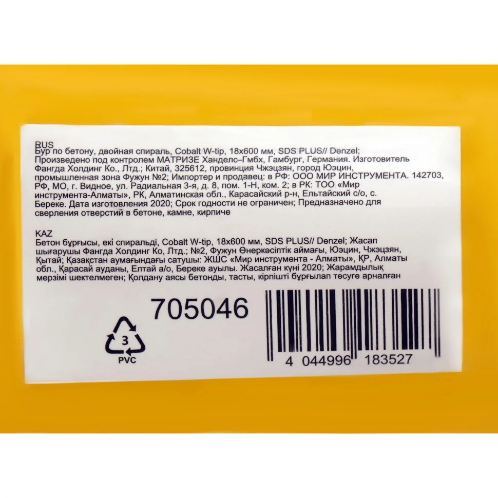 Бур по бетону Denzel арт. 705046 с хвостовиком SDS PLUS и двойной спиралью предназначен для сверления отверстий в бетоне, кирпиче и камне. Он используется в качестве оснастки для перфораторов с патроном SDS Plus. Бур оптимален для проведения строительных, ремонтных, монтажных работ.ПреимуществаВысокий ресурс — режущая твердосплавная пластина из стали ВК8 твердостью 80-90 HRC с W-образной заточкой способна сверлить отверстия до 30% быстрее, в том числе при работе с камнем.Прочность и износостойкость — рабочая часть из легированной стали 40Х выдерживает интенсивные и длительные ударные нагрузки, а также делает бур самым высокопроизводительным среди аналогов средней цены.Двойная спираль и канавка с дополнительным желобом — за счет более эффективного отвода шлама рабочая часть не перегревается, что позволяет продлить срок службы бура.Удобная упаковка с европодвесом — оснастку можно разместить на стенде.