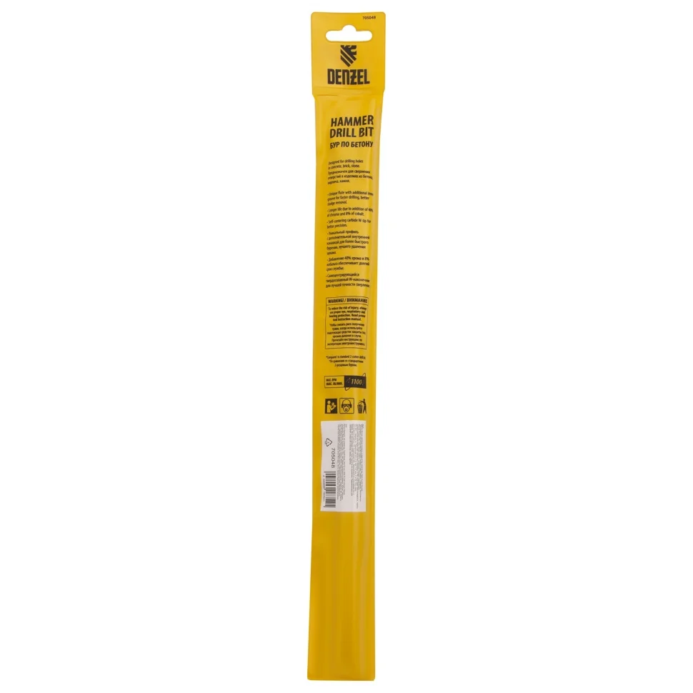 Бур по бетону Denzel арт. 705048 с хвостовиком SDS PLUS и двойной спиралью предназначен для сверления отверстий в бетоне, кирпиче и камне. Он используется в качестве оснастки для перфораторов с патроном SDS Plus. Бур оптимален для проведения строительных, ремонтных, монтажных работ.ПреимуществаВысокий ресурс — режущая твердосплавная пластина из стали ВК8 твердостью 80-90 HRC с W-образной заточкой способна сверлить отверстия до 30% быстрее, в том числе при работе с камнем.Прочность и износостойкость — рабочая часть из легированной стали 40Х выдерживает интенсивные и длительные ударные нагрузки, а также делает бур самым высокопроизводительным среди аналогов средней цены.Двойная спираль и канавка с дополнительным желобом — за счет более эффективного отвода шлама рабочая часть не перегревается, что позволяет продлить срок службы бура.Удобная упаковка с европодвесом — оснастку можно разместить на стенде.