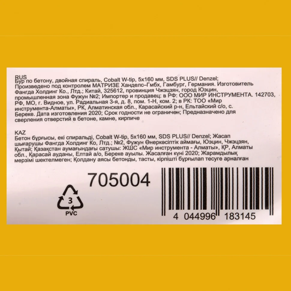 Бур по бетону Denzel арт. 705004 с хвостовиком SDS PLUS и двойной спиралью предназначен для сверления отверстий в бетоне, кирпиче и камне. Он используется в качестве оснастки для перфораторов с патроном SDS Plus. Бур оптимален для проведения строительных, ремонтных, монтажных работ.ПреимуществаВысокий ресурс — режущая твердосплавная пластина из стали ВК8 твердостью 80-90 HRC с W-образной заточкой способна сверлить отверстия до 30% быстрее, в том числе при работе с камнем.Прочность и износостойкость — рабочая часть из легированной стали 40Х выдерживает интенсивные и длительные ударные нагрузки, а также делает бур самым высокопроизводительным среди аналогов средней цены.Двойная спираль и канавка с дополнительным желобом — за счет более эффективного отвода шлама рабочая часть не перегревается, что позволяет продлить срок службы бура.Удобная упаковка с европодвесом — оснастку можно разместить на стенде.