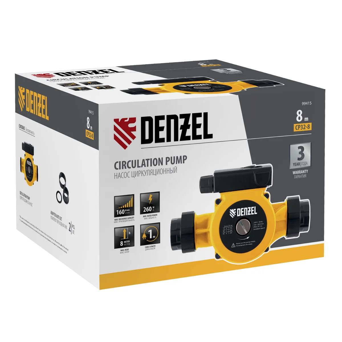 Циркуляционный насос CP32-8, напор 8 м, 160 л/мин, 1 м кабель, монт. длина 180 мм Denzel 99415