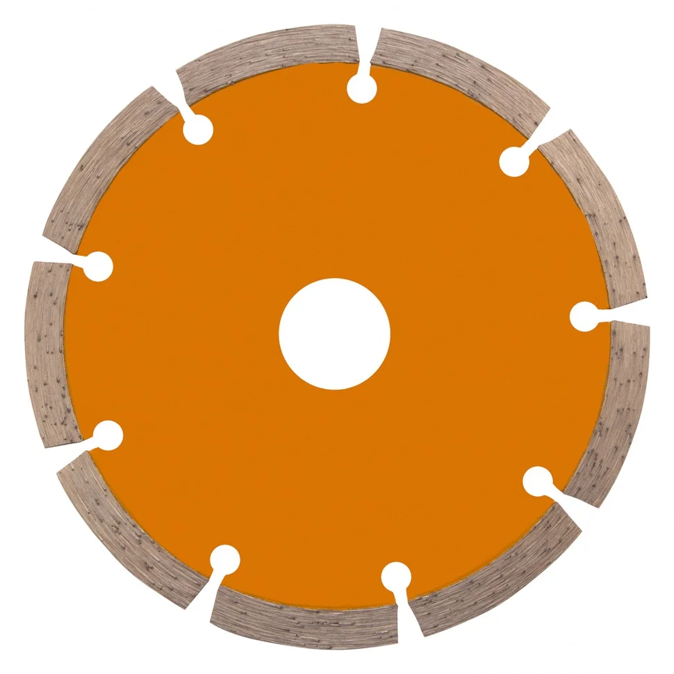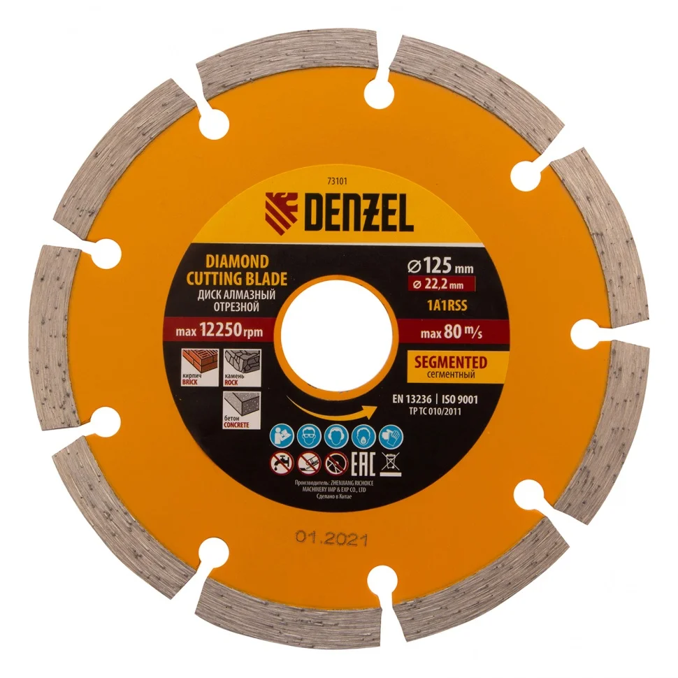 Отрезной алмазный диск Denzel Сегментный ф125 х 22,2 мм 73101 используется для сухого резания по свежему и старому бетону, камню, кирпичу, шлакоблоку, мрамору, тротуарной плитке. Он применяется в качестве сменного инструмента с профессиональными и бытовыми УШМ. Диск сегментного типа отличается высокой производительностью даже при интенсивных нагрузках, не требует водяного охлаждения.ПреимуществаЭффективность реза плотных материалов обеспечивает сбалансированная металлическая связка, устойчивая к перегреву и перегрузкам.Рабочая часть с высококонцентрированным алмазным слоем шириной 7 мм повышает скорость реза и износостойкость диска.Диск разделен на сегменты, что способствует хорошему отводу пыли во время работы.Изготовление по технологии холодного прессования позволяет добиться хороших режущих свойств диска.
