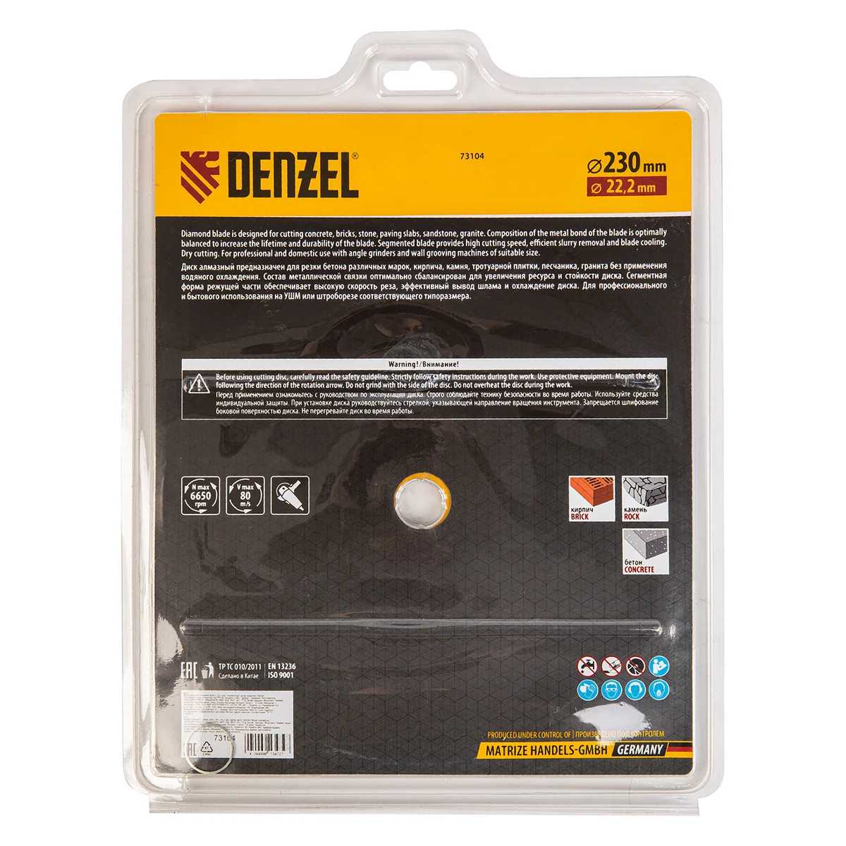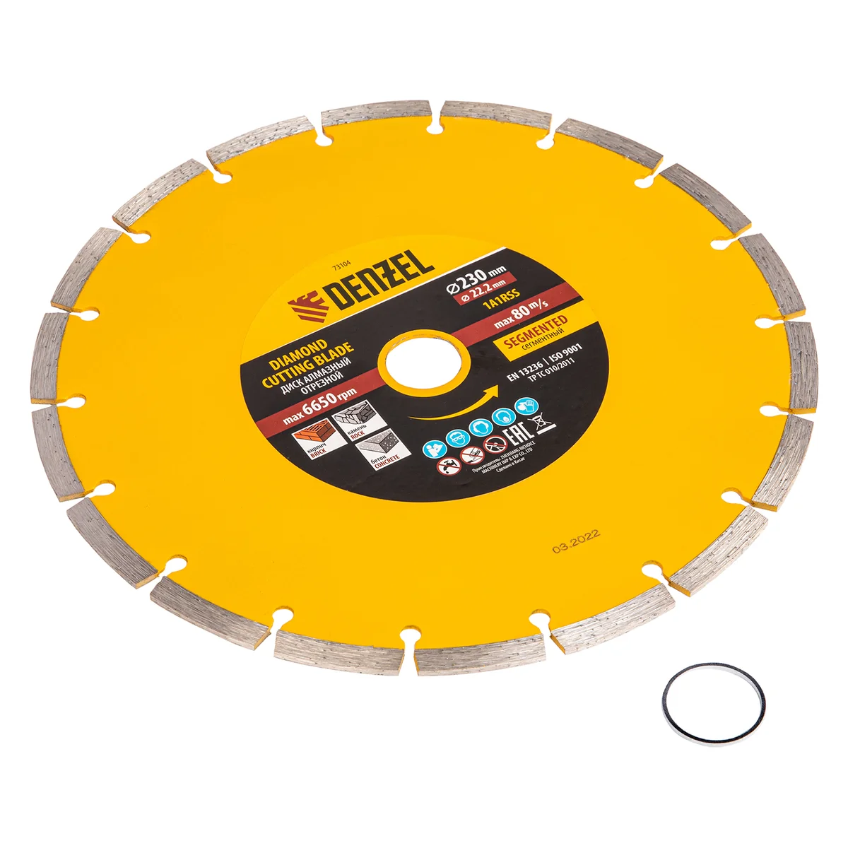 Отрезной алмазный диск Denzel Сегментный ф230 х 22,2 мм 73104 используется для сухого резания по свежему и старому бетону, камню, кирпичу, шлакоблоку, мрамору, тротуарной плитке. Он применяется в качестве сменного инструмента с профессиональными и бытовыми УШМ. Диск сегментного типа отличается высокой производительностью даже при интенсивных нагрузках, не требует водяного охлаждения.ПреимуществаЭффективность реза плотных материалов обеспечивает сбалансированная металлическая связка, устойчивая к перегреву и перегрузкам.Рабочая часть с высококонцентрированным алмазным слоем шириной 7 мм повышает скорость реза и износостойкость диска.Диск разделен на сегменты, что способствует хорошему отводу пыли во время работы.Изготовление по технологии холодного прессования позволяет добиться хороших режущих свойств диска.