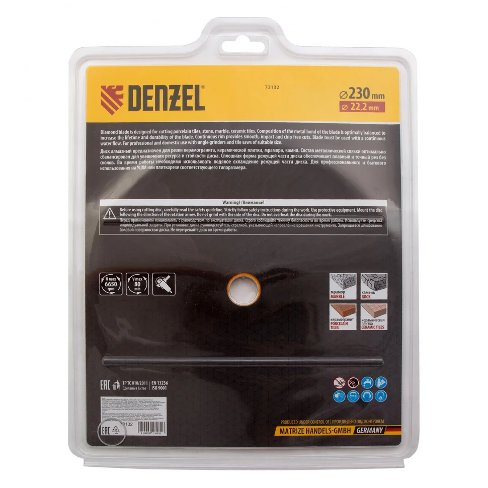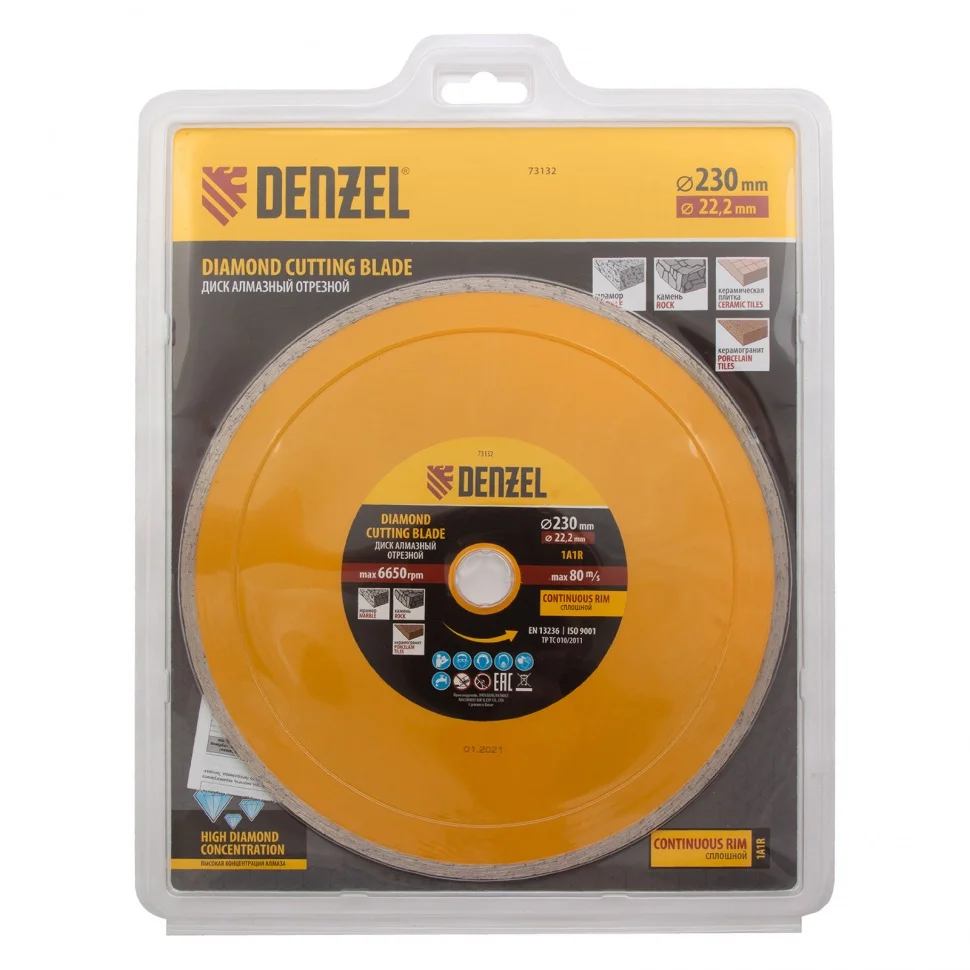 Отрезной алмазный диск Denzel Сплошной 73132, ф230 х 22,2 мм, используется для мокрого резания совместно с углошлифовальными машинами или плиткорезами с посадочным диаметром 22,2 мм. С его помощью режут камень, мрамор, керамогранитную и керамическую плитку. Диск отличается хорошей производительностью за счет высокой скорости реза, поэтому подходит для профессионального применения.ПреимуществаСплошная конструкция обеспечивает эффективное выполнение большого объема работ даже при резании хрупких материалов.Режущая кромка шириной 7 мм позволяет получить аккуратный срез без зазубрин и сколов.Диск обладает высоким рабочим ресурсом благодаря увеличенной концентрации алмазов в рабочем слое.Отрезной диск изготовлен способом холодного прессования.