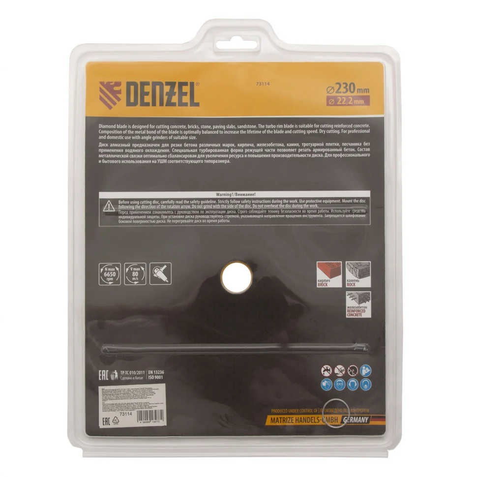Отрезной алмазный диск Denzel Турбо ф230 х 22,2 мм 73114 рассчитан на сухое резание камня, кирпича, свежего и затвердевшего бетона, железобетона. Он используется в качестве оснастки на УШМ с посадочным отверстием 22,2 мм при проведении бытовых и профессиональных отрезных работ. Турбо диск режет снижает ударную нагрузку при резании материалов и не требует водяного охлаждения.ПреимуществаКачественная металлическая связка обеспечивает эффективность работы с плотными материалами, т.к. устойчивая к высоким температурам.Режущий слой шириной 7 мм с высокой концентрацией алмазов позволяет увеличить скорость реза и износостойкость диска.Диск изготовлен по технологии холодного прессования, поэтому отличается хорошими режущими свойствами.
