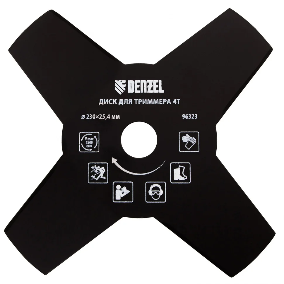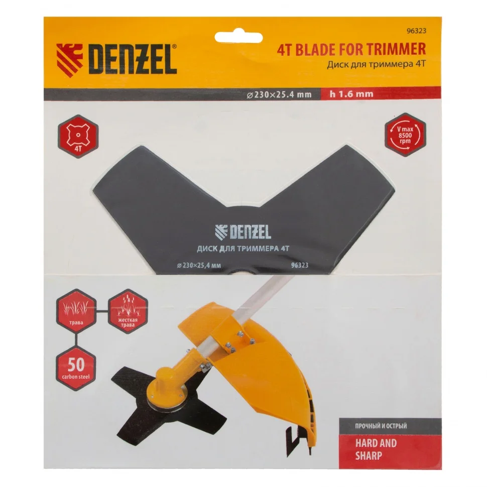 Диск для триммера Denzel 96323 размером 230 х 25,4 мм, толщиной 1,6 мм, с 4 лезвиями, предназначен для скашивания травы различных типов, в том числе с жесткими стеблями (полыни, крапивы, лебеды). Рекомендован к использованию со всеми типами бензиновых триммеров, а также с электрическими триммерами мощностью не менее 1,0 кВт, например Denzel 96611 и 96612.ПреимуществаПрочность и долговечность — диск изготовлен из стали и обработан порошковой краской для защиты от коррозии.4 лезвия — диск аккуратно срезает траву, делая более удобной работу по заготовке сена.Высокая производительность — лезвия с режущими кромками большой длины заточены с обеих сторон.
