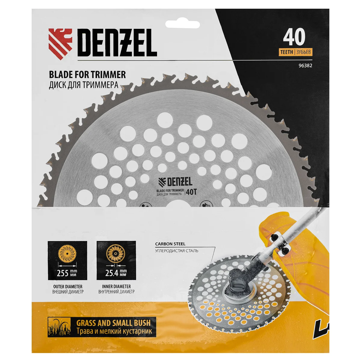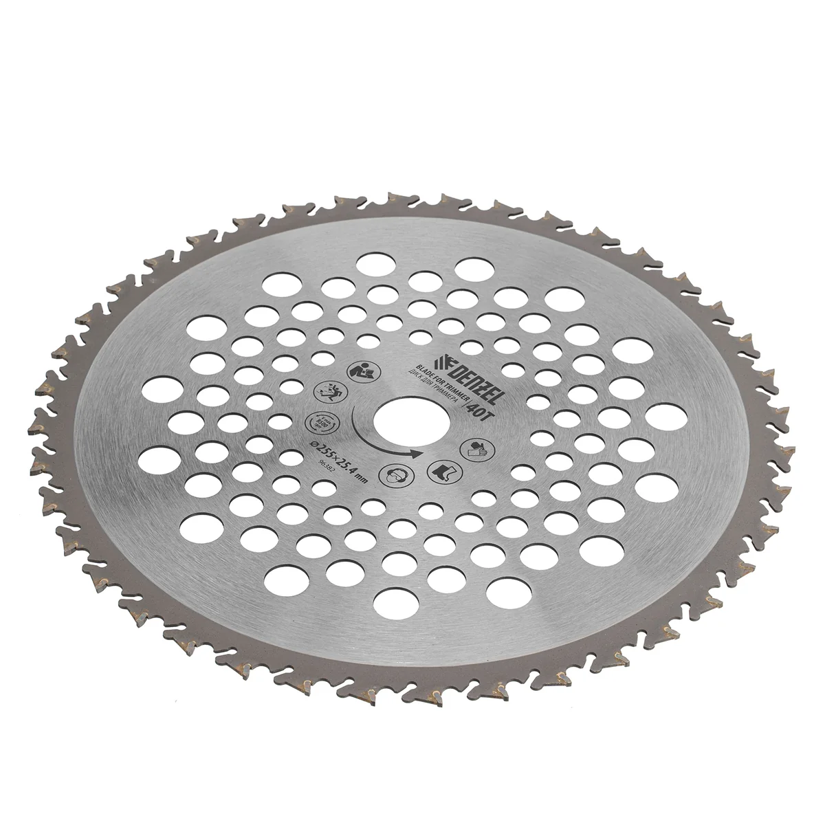 Диск для триммера Denzel 96382 с внешним диаметром 255 мм и посадочным — 25,4 мм, с 40 зубьями Anti-Kick, используется для скашивания жесткой травы, борщевика и других сорняков с толстыми стеблями, а также подпиливания кустарников и тонких деревьев. Оптимален для работы с мощными бензотриммерами. Будет полезен для расчистки территории и подготовки участка к вспашке и застройке.ПреимуществаПрочность — диск из углеродистой стали выдерживает высокие динамические нагрузки.Продуманная конструкция — режущие зубья с твердосплавными напайками из карбида вольфрама делают диск универсальным для скашивания всех видов растительности.Безопасная работа — за счет специальной формы Anti-Kick зубья не дают диску резко углубляться, позволяя исключить отскок при сильном заглублении.Увеличенная скорость скашивания — диск обеспечивает высокую производительность триммера, что позволяет быстро справиться с работой.