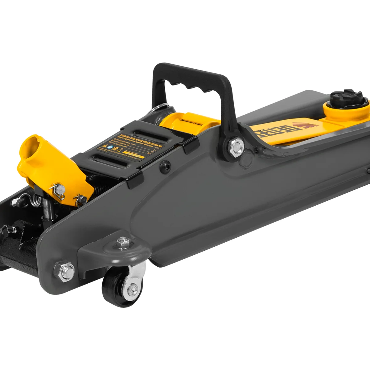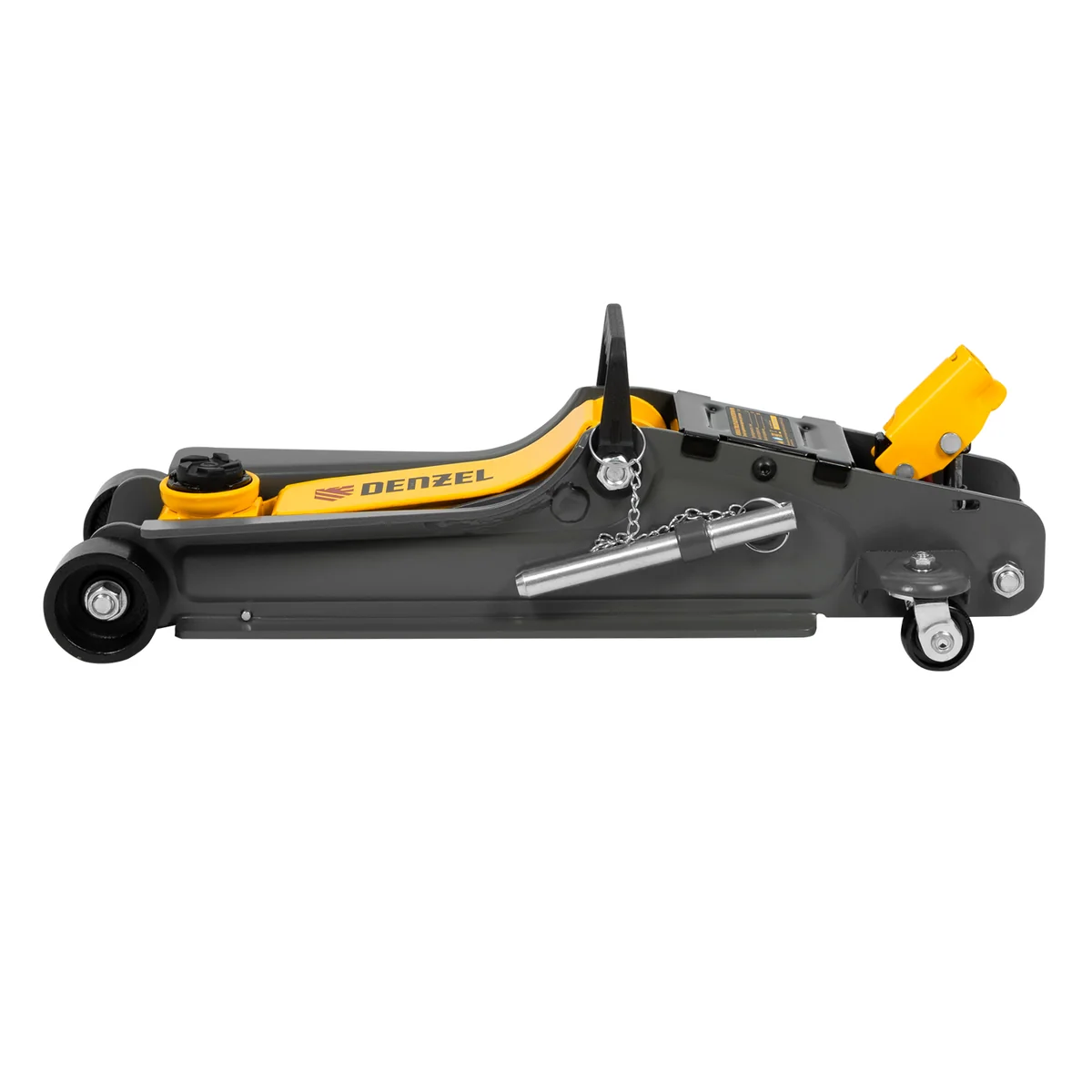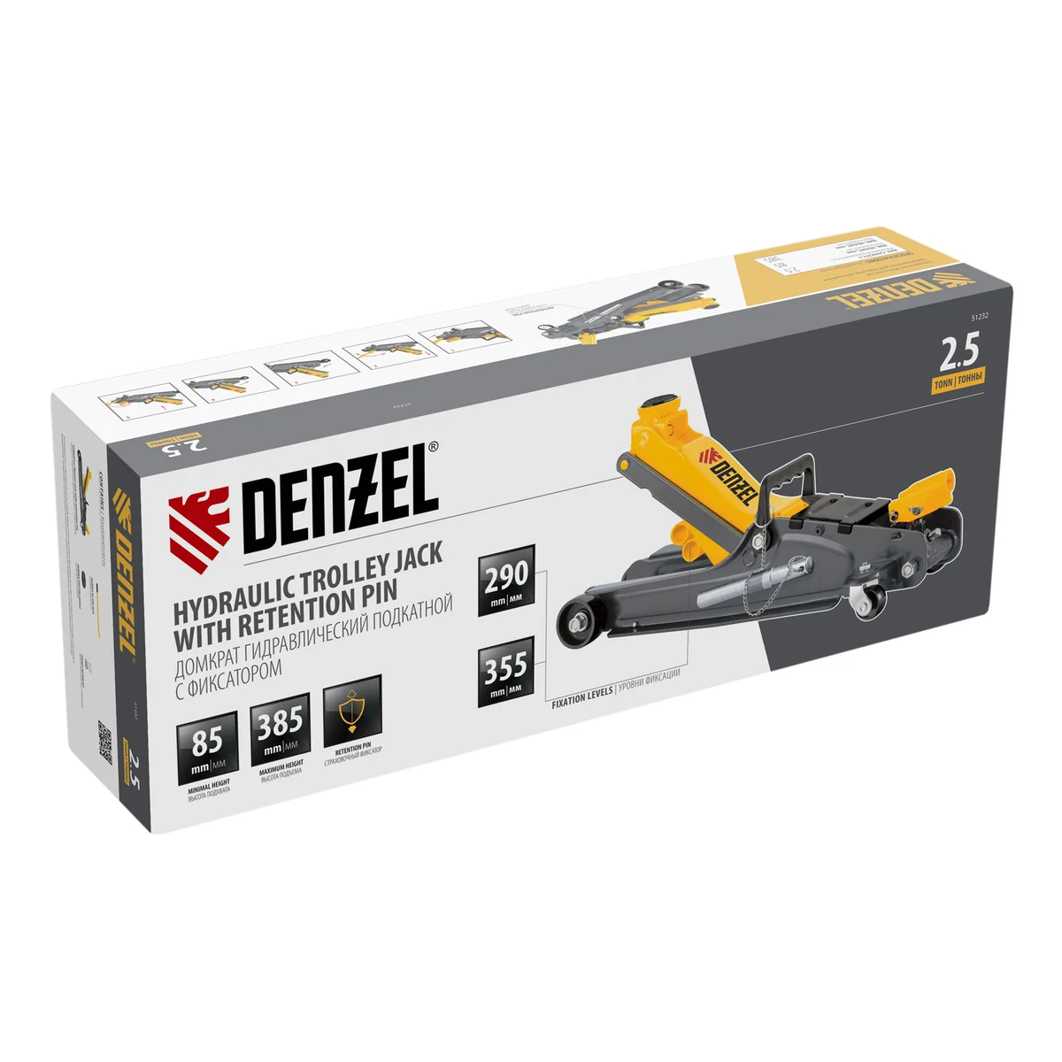 Гидравлический подкатной домкрат Denzel 51232 с фиксатором имеет высоту подхвата 85 мм и предназначен для плавного подъема грузов массой до 2,5 т на высоту до 385 мм. Страховочный штифт позволяет фиксировать подъемный рычаг на высоте 290 и 355 мм для безопасной работы. Домкрат пригодится владельцам легковых автомобилей с низким и стандартным клиренсом.