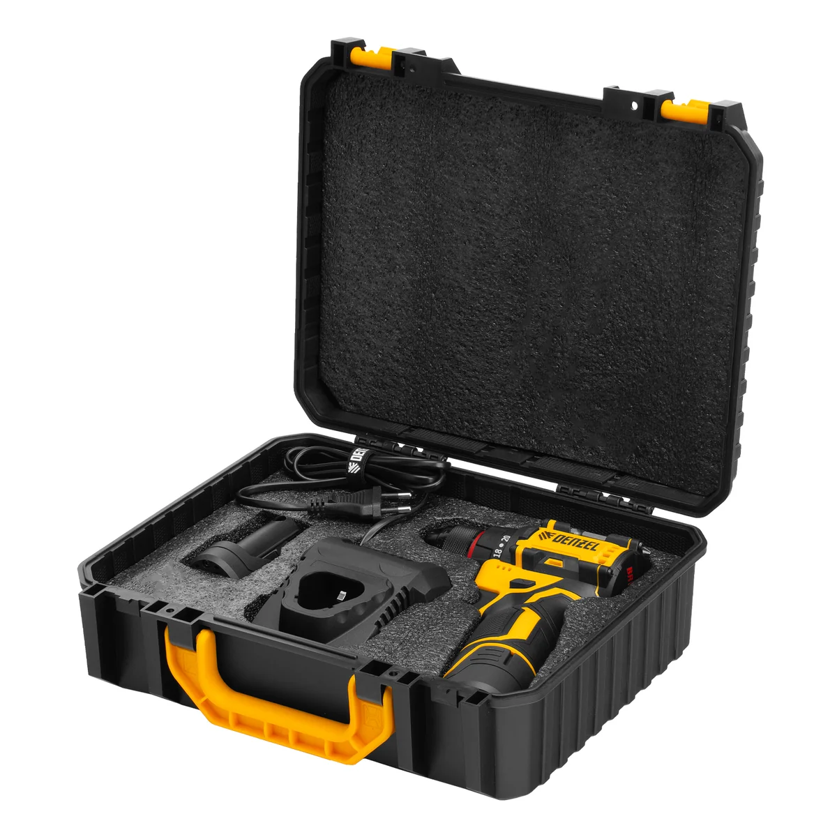 - Надежная упаковка — дрель-шуруповерт с аксессуарами поставляется в прочном пластиковом кейсе.