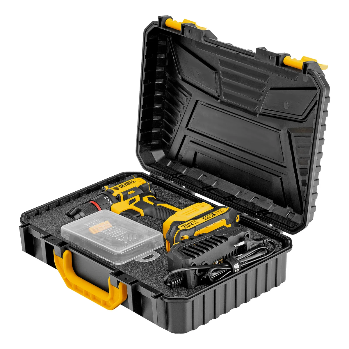 - Удобное хранение и транспортировка — дрель-шуруповерт с аксессуарами поставляется в прочном пластиковом кейсе.