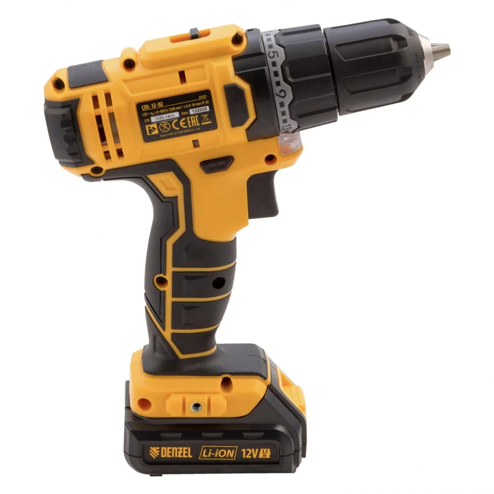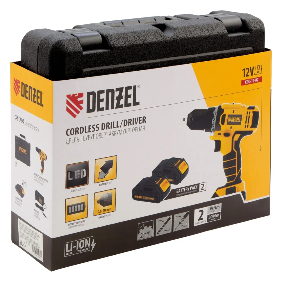 Аккумуляторная дрель-шуруповерт Denzel CDL-12-02 21601 с 2 батареями Li-Ion напряжением 12 В и емкостью 1,5 Ач и используется для закручивания и откручивания шурупов и саморезов, а также для сверления отверстий диаметром до 12 мм в древесине и до 6 мм в металле. Плавная регулировка частоты вращения оснастки в диапазоне 0-400 или 0-1500 об/мин и крутящего момента от 8 до 15 Нм позволяют максимально точно настроить инструмент в зависимости от вида работы. Запасной аккумулятор в комплекте обеспечивает непрерывную работу.ПреимуществаБыстрая замена оснастки — редуктор с опцией блокировки шпинделя и быстрозажимной патрон позволяют установить насадку без дополнительных инструментов.Переключатель реверса — можно менять направление вращения патрона для выкручивания застрявших шурупов и использования левосторонней оснастки.Мгновенная остановка двигателя — благодаря электрическому тормозу снижается риск перетяжки крепежа.Подсветка рабочей зоны — дрелью-шуруповертом можно работать даже при плохом освещении.Контроль заряда батареи — удобный индикатор позволяет вовремя заряжать аккумулятор.Быстрая подготовка к работе — аккумулятор полностью заряжается всего за 1 час.Надежные аккумуляторы — элементы питания имеют систему распознавания нагрузки, защиту от глубокого разряда и нежелательного перезаряда, что повышает их ресурс.Комфортная работа — рукоятка с резиновыми вставками уменьшает вибрации и обеспечивает надежный хват.Удобная транспортировка и хранение — дрель-шуруповерт поставляется в прочном пластиковом кейсе.Гарантия 3 года — высокое качество инструмента подтверждено производителем.