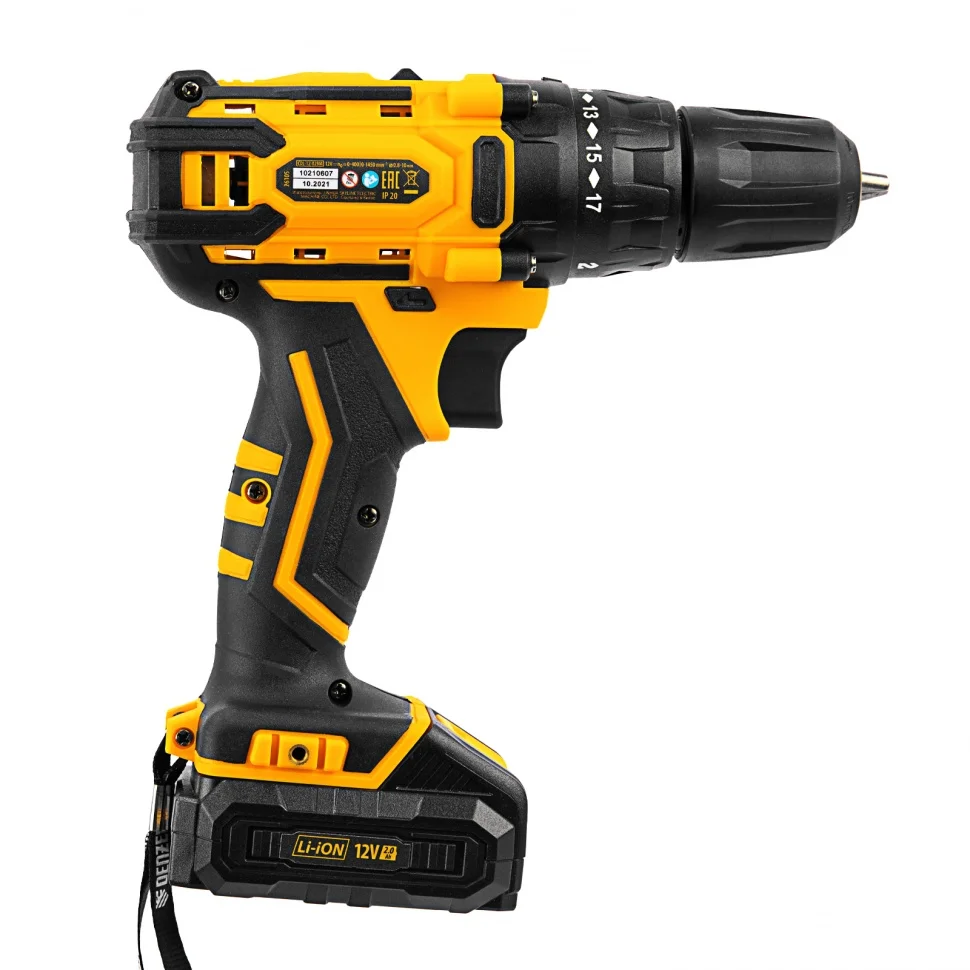 Аккумуляторная дрель-шуруповерт Denzel CDL-12-02BM 26105 с 2 батареями Li-Ion 12 В предназначена для монтажа и демонтажа резьбовых соединений, cверления отверстий в металле (до 10 мм), древесине (до 16 мм), пластмассе и других материалах. Инструмент пригодится профессионалам и любителям на строительной площадке, дома или на даче.Надежные литий-ионные аккумуляторы без эффекта памяти и защитой от глубокого разряда обеспечивают долгий срок службы инструмента. Дрель не зависит от сети питания, что делает удобной работу на строительных объектах, на высоте и в отдаленных участках дома.Преимущества17+1 ступень регулировки крутящего момента — вы с легкостью подберете оптимальное усилие затяжки под тип крепежа.Два режима вращения — можно настроить скорость в диапазоне 0-400 или 0-1450 об/мин для работы с резьбовыми крепежами и сверления отверстий.Мгновенное переключение между задачами — реверс позволяет быстро перейти от монтажа к демонтажу крепежных элементов.Подсветка рабочей зоны — решать поставленные задачи удобно даже в условиях плохой освещенности и в труднодоступных местах.Защита от перетягивания крепежа — благодаря тормозу выбега шпиндель моментально останавливается после выключения.Высокий ресурс — корпус из ударопрочного пластика и металлические шестерни редуктора обеспечивают долгий срок службы инструмента.Бесперебойная работа — в комплект поставки входит зарядное устройство и 2 аккумулятора с индикацией уровня заряда.Быстрая и безопасная зарядка — на восстановление работоспособности аккумулятора требуется всего 1 час, о завершении процесса свидетельствует зеленый цвет индикатора на зарядном устройстве.Быстрая смена оснастки — блокировка шпинделя и одномуфтовый патрон позволяют снимать и устанавливать биты и сверла одной рукой.Дополнительные возможности — инструмент можно закрепить на ремне или кармане при помощи специального крюка.Комфортная работа — прорезиненная рукоятка обеспечивает надежный хват и поглощает вибрации, снижая нагрузку на руки мастера.Удобное хранение и транспортировка — дрель-шуруповерт поставляется в надежном пластиковом кейсе.Гарантия 3 года — качество инструмента подтверждено производителем.
