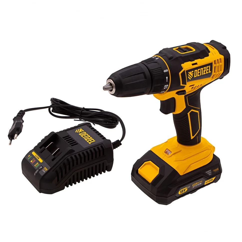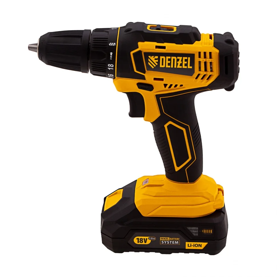 Аккумуляторная дрель-шуруповерт Denzel CDL-18-01CB 26115 с Li-Ion аккумулятором 18 В предназначена для ввинчивания и вывинчивания винтов и шурупов, а также получения отверстий в различных конструкционных материалах: металле, древесине, пластмассе и т.п. Оптимальна для интенсивного использования как в быту, так и на строительных объектах, пригодится в процессе ремонта, при сборке мебели и т.д. Система защиты от перегрузки, перегрева, глубокой разрядки и нежелательного перезаряда обеспечивает долговечность инструмента и комфортную работу.Преимущества18+1 ступень регулировки — дрель-шуруповерт удобно настроить под материалы разной жесткости и получить высококачественный результат.Две скорости вращения (0-400/0-1500 об/мин) — первая позволяет работать с крепежом, вторая — сверлить отверстия.Точный и аккуратный результат — тормоз выбега мгновенно останавливает двигатель, исключая риск перетяжки крепежа.Долговечность — шестерни редуктора выполнены из металла, корпус — из ударопрочного пластика.Расширенный функционал — реверс позволяет работать с левой резьбой и откручивать крепежные элементы.Подсветка рабочей зоны — инструмент эффективен даже в условиях недостаточного освещения и труднодоступных местах.Быстрая зарядка — разряженный литий-ионный аккумулятор будет полностью готов к работе всего лишь за 1 час.LED индикатор заряда батареи — мастер сможет вовремя зарядить аккумулятор и избежать непредвиденной остановки да.Универсальность — аккумуляторная батарея Li-ion емкостью 2 Ач совместима с любым инструментом из модельного ряда единой платформы Denzel Battery System 18V.Продуманная конструкция — обрезиненное покрытие корпуса, клавиши включения и нижней части батареи исключают проскальзывание инструмента на любых поверхностях.Комфорт и защита суставов — прорезиненная рукоятка удобно ложится в руку, не проскальзывает в процессе работы и снижает уровень вибраций.Удобная смена оснастки — быстрозажимной патрон 0,8-10 мм позволяет быстро подготовить инструмент к работе или переключиться между задачами.Малый вес (1,274 кг вместе с аккумулятором) — инструмент удобно удерживать на весу долгое время.Всё необходимое в комплекте — дрель-шуруповерт поставляется с аккумулятором и зарядным устройством.Гарантия 3 года — качество инструмента подтверждено производителем.