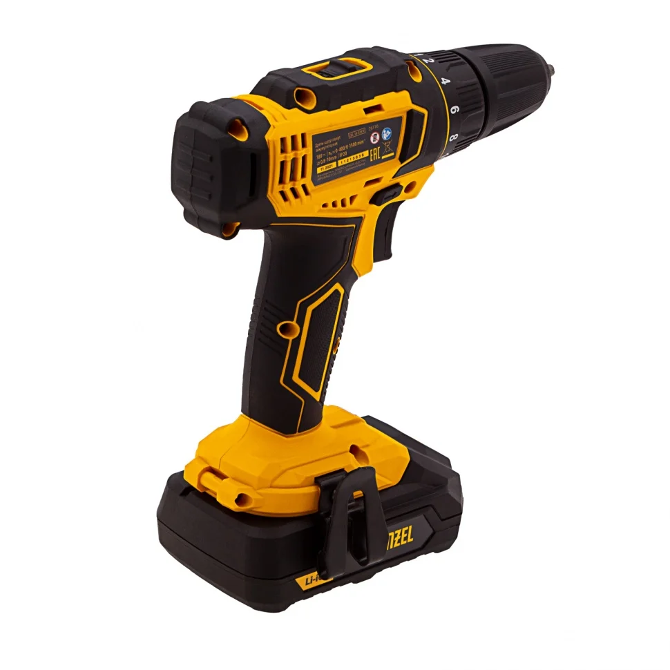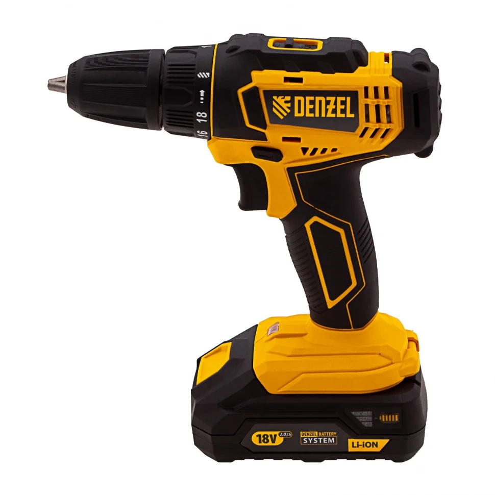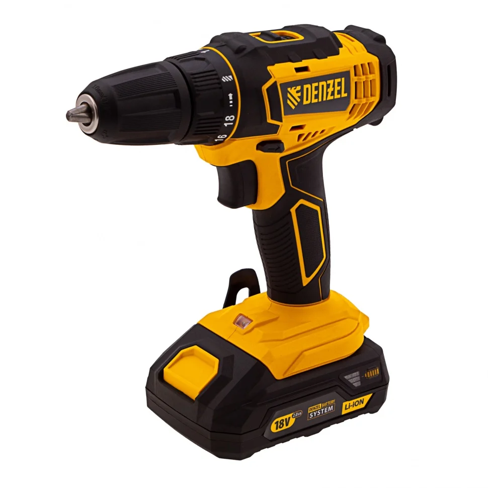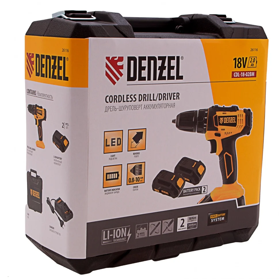 Аккумуляторная дрель-шуруповерт Denzel CDL-18-02BM 26116 с Li-Ion аккумуляторами 18 В предназначена для ввинчивания и вывинчивания винтов и шурупов, а также получения отверстий в различных конструкционных материалах: металле, древесине, пластмассе и т.п. Оптимальна для интенсивного использования как в быту, так и на строительных объектах, пригодится в процессе ремонта, при сборке мебели и т.д. Система защиты от перегрузки, перегрева, глубокой разрядки и нежелательного перезаряда обеспечивает долговечность инструмента и комфортную работу.Преимущества18+1 ступень регулировки — дрель-шуруповерт удобно настроить под материалы разной жесткости и получить высококачественный результат.Две скорости вращения (0-400/0-1500 об/мин) — первая позволяет работать с крепежом, вторая — сверлить отверстия.Точный и аккуратный результат — тормоз выбега мгновенно останавливает двигатель, исключая риск перетяжки крепежа.Долговечность — шестерни редуктора выполнены из металла, корпус — из ударопрочного пластика.Расширенный функционал — реверс позволяет работать с левой резьбой и откручивать крепежные элементы.Подсветка рабочей зоны — инструмент эффективен даже в условиях недостаточного освещения и труднодоступных местах.Быстрая зарядка — разряженный литий-ионный аккумулятор будет полностью готов к работе всего лишь за 1 час.Работа без непредвиденных остановок — LED-индикатор позволяет отслеживать заряд АКБ, также инструмент комплектуется запасной батареей.Универсальность — аккумуляторные батареи Li-ion емкостью 2 Ач совместимы с любым инструментом из модельного ряда единой платформы Denzel Battery System 18V.Продуманная конструкция — обрезиненное покрытие корпуса, клавиши включения и нижней части батареи исключают проскальзывание инструмента на любых поверхностях.Комфорт и защита суставов — прорезиненная рукоятка удобно ложится в руку, не проскальзывает в процессе работы и снижает уровень вибраций.Удобная смена оснастки — быстрозажимной патрон 0,8-10 мм позволяет быстро подготовить инструмент к работе или переключиться между задачами.Малый вес (1,274 кг вместе с аккумулятором) — инструмент удобно удерживать на весу долгое время.Всё необходимое в комплекте — дрель-шуруповерт с двумя аккумуляторами и зарядным устройством поставляется в удобном пластиковом кейсе.Гарантия 3 года — качество инструмента подтверждено производителем.