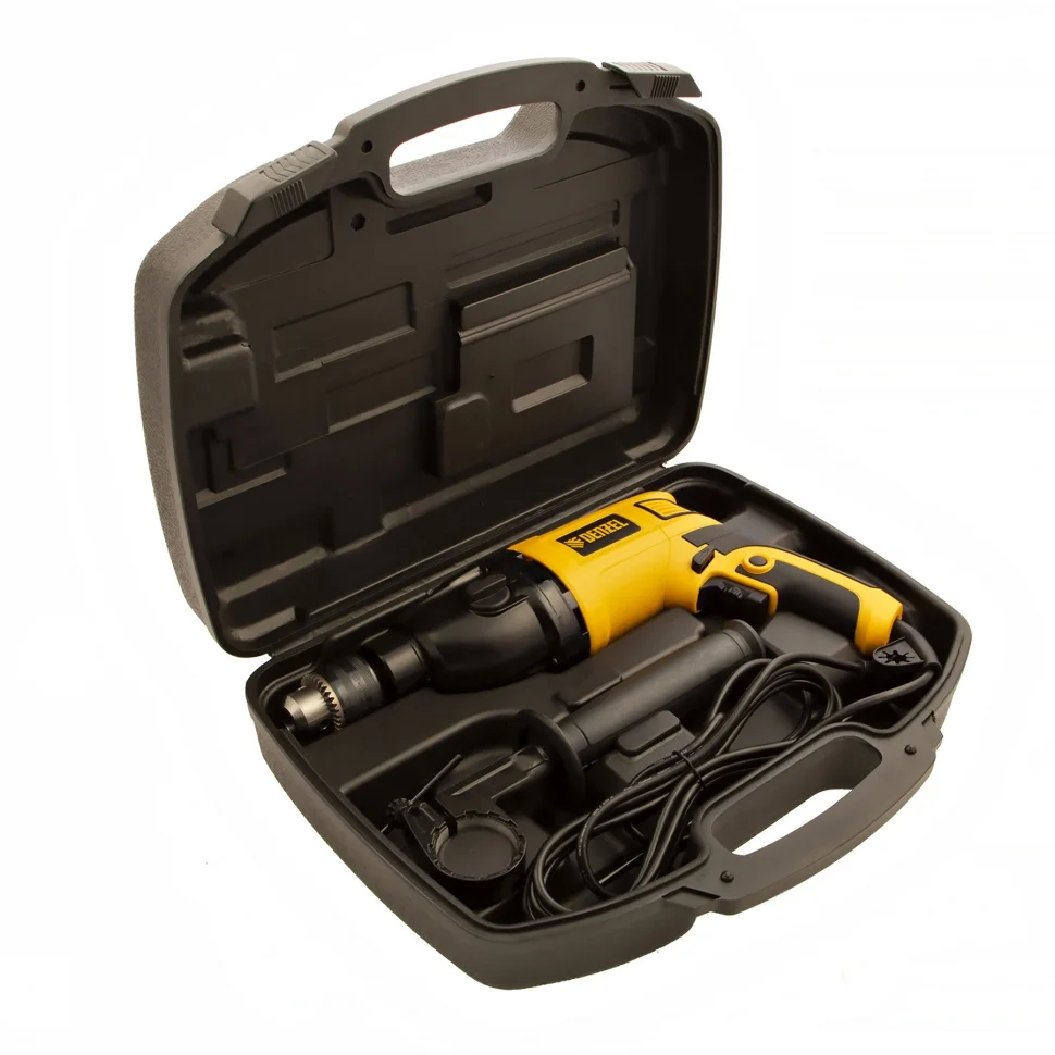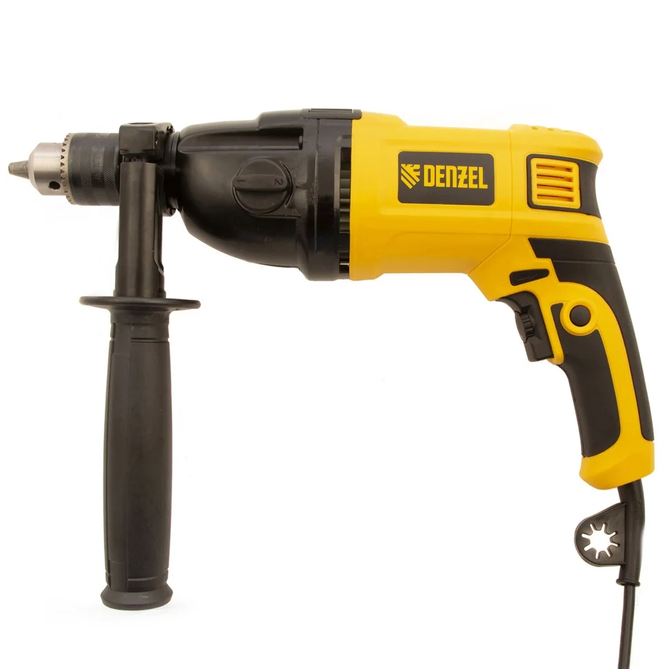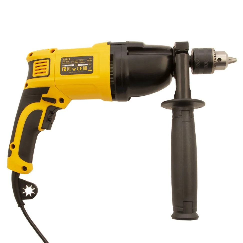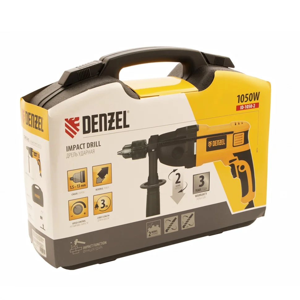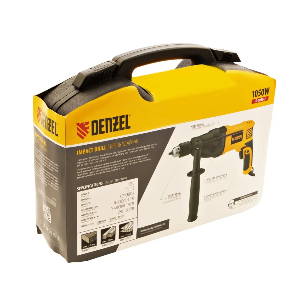 Ударная дрель Denzel ID-1050-2 26312 мощностью 1050 Вт, поддерживает 2 скорости вращения оснастки 0-3000/0-1100 об/мин и частоту ударов 0-48000/0-17600 уд/мин. Используется для ручного или ударного сверления металла, древесины, легкого бетона, кирпича, плитки или пластика. Сверлит отверстия диаметром до 25 мм в древесине, до 13 мм в бетоне и до 13 мм в металле. Эффективное сверление твердых материалов обеспечивает массивный промщит ударного механизма. Дрель работает со сверлами с диаметром хвостовика 1,5-13 мм, что позволяет эффективно решать различные задачи.ПреимуществаВыбор оптимального режима — предусмотрена плавная регулировка частоты вращения патрона и возможность отключения ударного режима для работы с материалами разной плотности.Высокий ресурс — медная обмотка двигателя, усовершенствованная конструкция щеточного узла и металлический корпус редуктора выдерживают интенсивное использование.Эффективное решение широкого спектра задач — наличие 2 скоростей работы расширяет возможности применения инструмента.Безопасность пользователя — токопроводящие элементы имеют двойную изоляциюРеверс — можно изменять направление вращения патрона для использования левосторонних сверл или шлифовальной оснастки.Удобное использование — клавиша фиксации кнопки включения позволяет избежать самопроизвольного переключения частоты вращения.Надежная фиксация оснастки — трехкулачковый самоцентрирующийся патрон затягивается с помощью ключа.Сверление отверстий заданной глубины — предусмотрена возможность установки специального ограничителя.Держатель для ключа — аксессуар не потеряется во время работы и хранения.Защита от перегрева — вентиляционные отверстия на корпусе обеспечивают эффективный отвод тепла.Свободное перемещение по рабочей зоне — длина кабеля питания составляет 3 м.Комфортная работа — основная и боковая рукоятки не выскальзывают из рук.Удобное хранение и транспортировка — дрель поставляется в прочном кейсе.Гарантия 3 года — надежность инструмента подтверждена производителем.