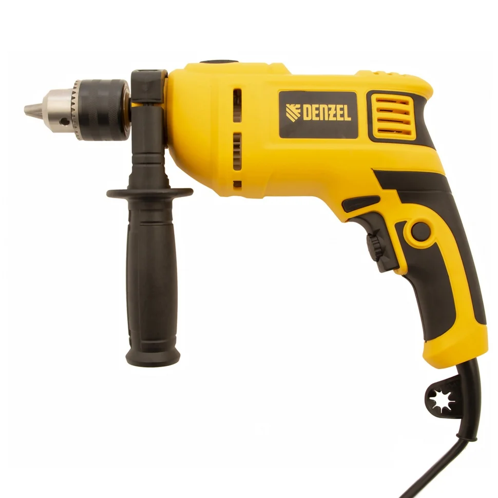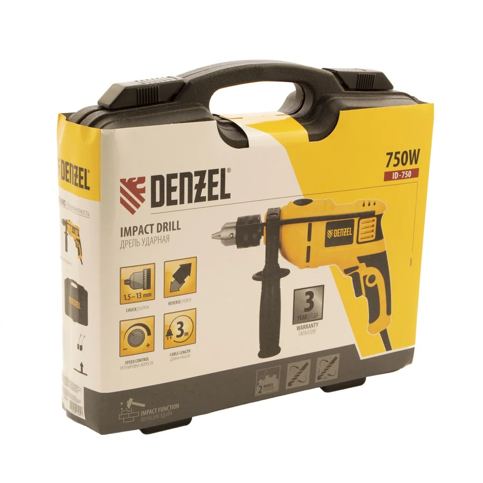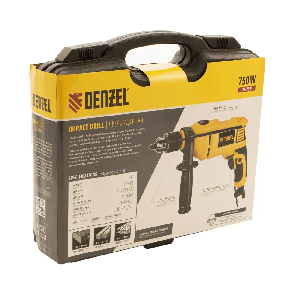 Ударная дрель Denzel ID-750 26307 мощностью 750 Вт поддерживает скорость вращения оснастки 0-3000 об/мин и частоту ударов 48000 уд/мин. Используется для ручного или ударного сверления металла, древесины, легкого бетона, кирпича, плитки или пластика. Сверлит отверстия диаметром до 25 мм в древесине, до 13 мм в бетоне и до 13 мм в металле. Эффективное сверление твердых материалов обеспечивает массивный промщит ударного механизма. Дрель работает со сверлами с диаметром хвостовика 1,5-13 мм, что позволяет эффективно решать различные задачи.ПреимуществаВыбор оптимального режима — предусмотрена плавная регулировка частоты вращения патрона и возможность отключения ударного режима для работы с материалами разной плотности.Высокий ресурс — медная обмотка двигателя, усовершенствованная конструкция щеточного узла и прочный пластиковый корпус выдерживают интенсивное использование.Безопасность пользователя — токопроводящие элементы имеют двойную изоляциюРеверс — можно изменять направление вращения патрона для использования левосторонних сверл или шлифовальной оснастки.Удобное использование — клавиша фиксации кнопки включения позволяет избежать самопроизвольного переключения частоты вращения.Надежная фиксация оснастки — трехкулачковый самоцентрирующийся патрон затягивается с помощью ключа.Сверление отверстий заданной глубины — предусмотрена возможность установки специального ограничителя.Держатель для ключа — аксессуар не потеряется во время работы и хранения.Защита от перегрева — вентиляционные отверстия на корпусе обеспечивают эффективный отвод тепла.Свободное перемещение по рабочей зоне — длина кабеля питания составляет 3 м.Комфортная работа — основная и боковая рукоятки не выскальзывают из рук, дрель весит 1,95 кг, что позволяет долго работать без ощущения усталости.Удобное хранение и транспортировка — дрель поставляется в прочном кейсе.Гарантия 3 года — надежность инструмента подтверждена производителем.