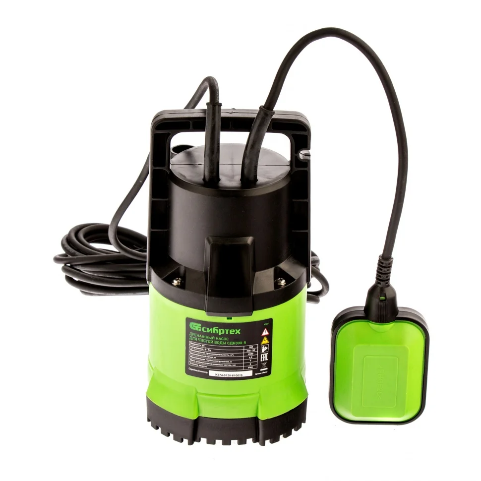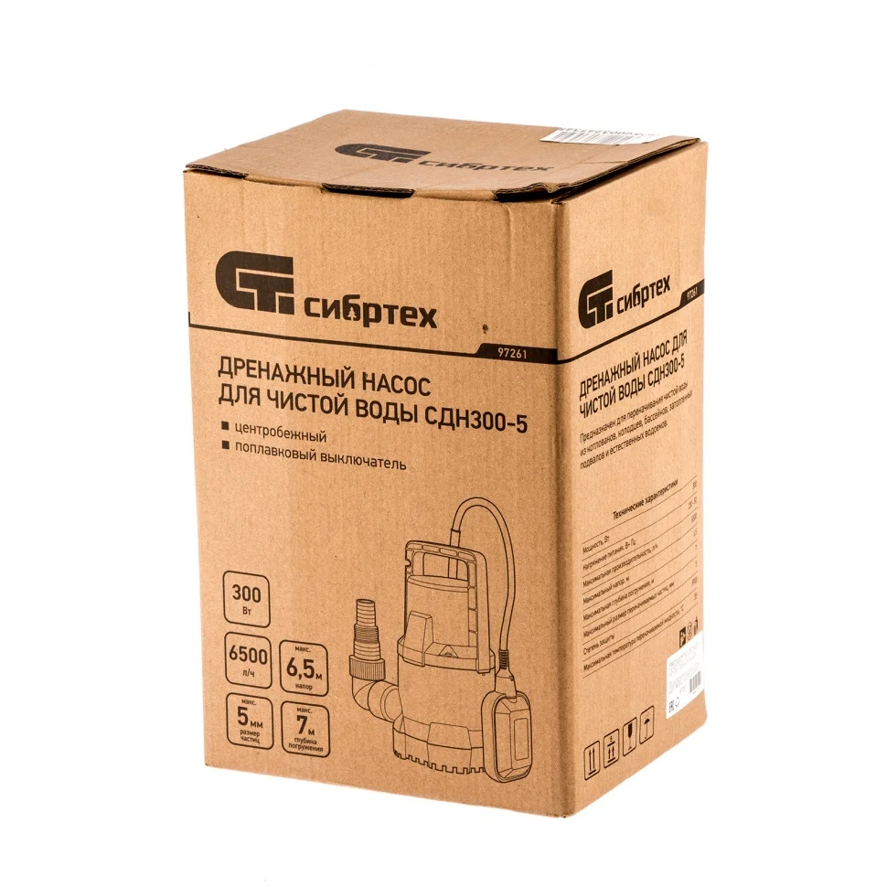 Дренажный насос для чистой воды Сибртех СДН300-5 97261 мощностью 300 Вт предназначен для осушения колодцев, затопленных помещений, бассейнов, а также для организации систем орошения и водоснабжения со скоростью 6500 л/ч, обеспечивая напор 6,5 м. Насос питается от однофазной сети с напряжением 230 В, поэтому идеально подходит для применения в частных домах, дачных коттеджах и небольших строительных объектах.ПреимуществаНадежная и комфортная работа — корпус из пластика предохраняет внутренние узлы от повреждений и снижает уровень шума от работающего двигателя.Степень защиты IPX8 — погружение насоса на большую глубину полностью безопасно, риск попадания воды на электронные компоненты исключен.Автоматическая работа — поплавок-выключатель запускает и отключает двигатель при достижении необходимого уровня воды, что предотвращает эксплуатацию всухую и позволяет пользователю не находиться постоянно около насоса.Герметичное соединение — шланги и трубы надежно стыкуются с насосом, это исключает потерю воды и позволяет добиться стабильно высокой производительности.Электробезопасность — сетевой кабель длиной 7 м и штепсельная вилка с заземлением входят в комплект поставки и позволяют эксплуатировать насос, не боясь поражения током.Удобное погружение и комфортная транспортировка — переносная ручка позволяет привязывать к насосу веревку (трос) и эксплуатировать его в вертикальных ямах или колодцах, а также перемещать до нужного места.Минимальное техническое обслуживание — за насосом достаточно просто ухаживать, необходимо лишь очищать пластичную крыльчатку по мере ее засорения.