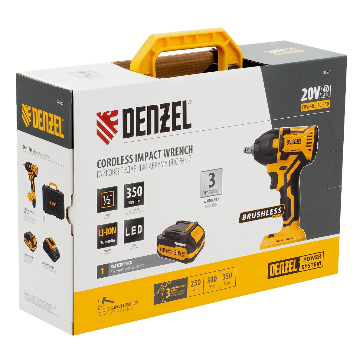 Гайковерт ударный аккумуляторный бесщет. CIWH-BL-20-350, Li-Ion, 20 В Denzel 26520