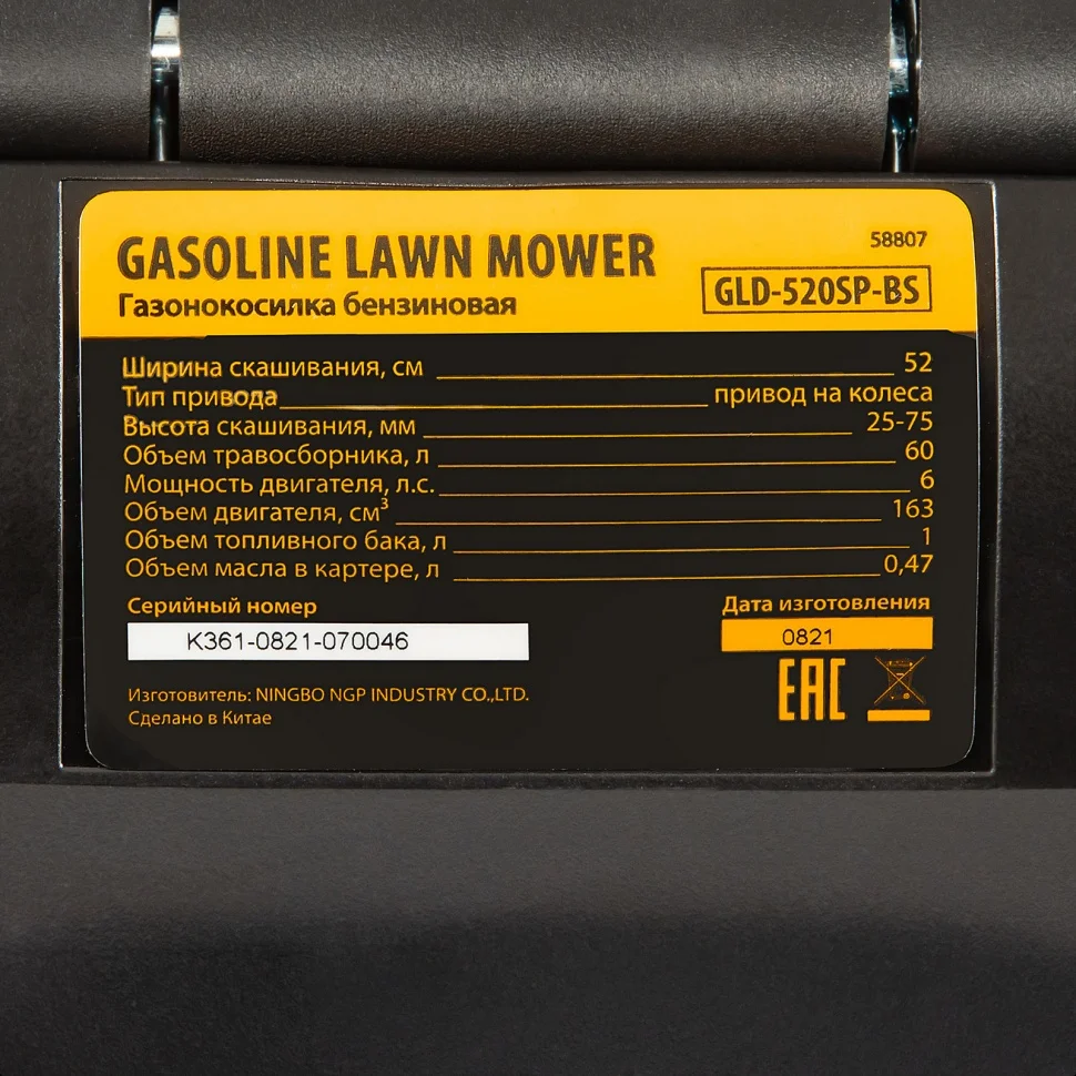 Бензиновая газонокосилка Denzel GLD-520SP-BS 58807 с двигателем Briggs Stratton объемом 163 куб. см и мощностью 6 л.с., с приводом на колеса и травосборником объемом 60 л, обеспечивает ширину прохода 52 см. Она способна не только подравнять газон, но и скосить густую траву, справиться со стеблями и бурьяном. За 1,5 часа получится обработать участок площадью до 2800 кв.м. При этом топливный бак объемом 1 л можно заправлять не чаще 1 раза в час. В модели предусмотрена 7-уровневая регулировка высоты среза от 25 до 75 мм.ПреимуществаРежим мульчирования — тщательно перемолотая трава распределяется по газону в качестве удобрения, что экономит время на опустошение травосборника.Функция бокового выброса — вы с легкостью сможете готовить траву к сушке.Регулировка скорости — можно переключаться с высоких оборотов на низкие для срезания густой травы или обработки маленького участка газона.Надежность — мощный двигатель Briggs &, Stratton рассчитан на длительное использование.Быстрый запуск — функция автоподкачки топлива позволяет легко завести технику даже после долгого простоя.Легкое перемещение — благодаря передаче крутящего момента с двигателя на колеса газонокосилку не нужно толкать.Маневренность — большие задние колеса повышают проходимость косилки и при этом не повреждают газон.Вместительный травосборник — контейнер объемом 60 л не требует частого опустошения, о его наполненности сообщает специальный индикатор.Защита двигателя — воздушный фильтр предотвращает попадание твердых частиц в механизм.Прочная конструкция — дека из противоударного материала выдерживает активное использование.Быстрая очистка — газонокосилка оснащена системой Quick Clean со штуцером для подачи воды в полость деки.Готовность к работе — в комплект входит крепеж, фиксатор троса и все необходимые аксессуары.Удобная рукоятка — покрытие из вспененной резины сглаживает вибрации, снижая нагрузку на руки во время длительной работы.Комфортное использование — уровень шума работающей машины сопоставим с компактными косилками и не превышает 98 дБ.Гарантия 3 года — качество газонокосилки подтверждено производителем.