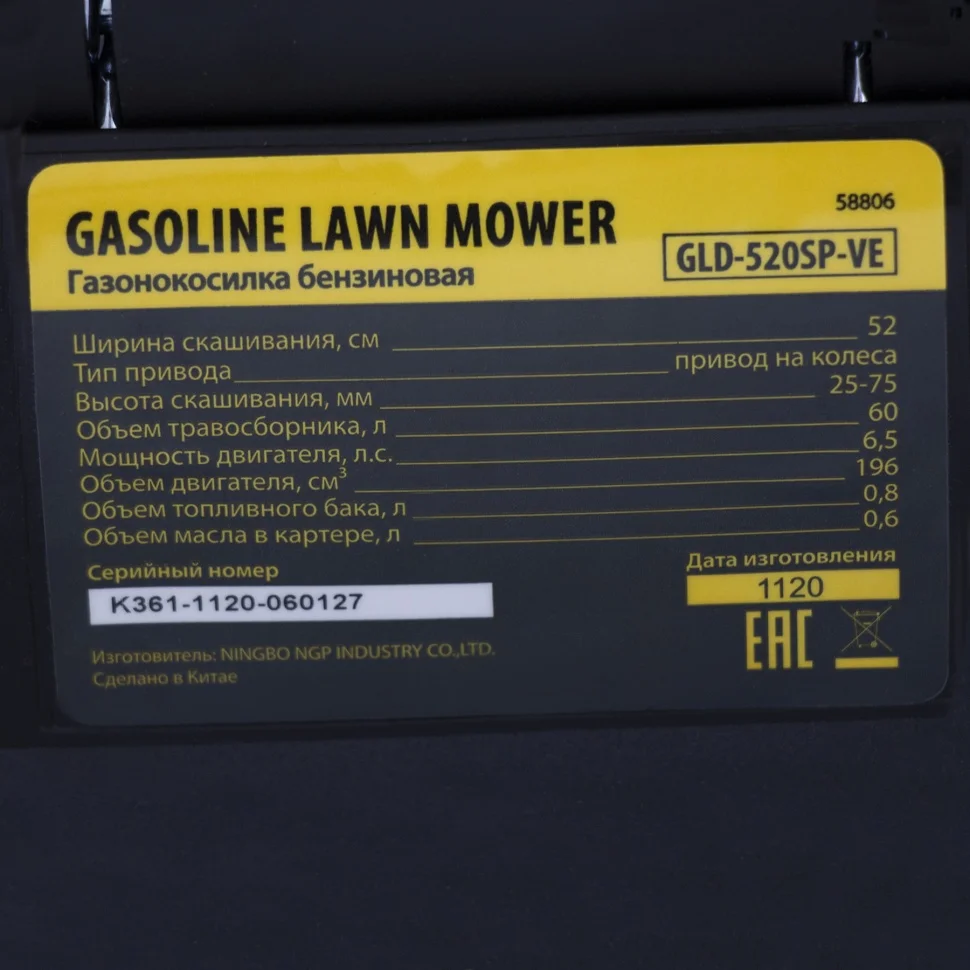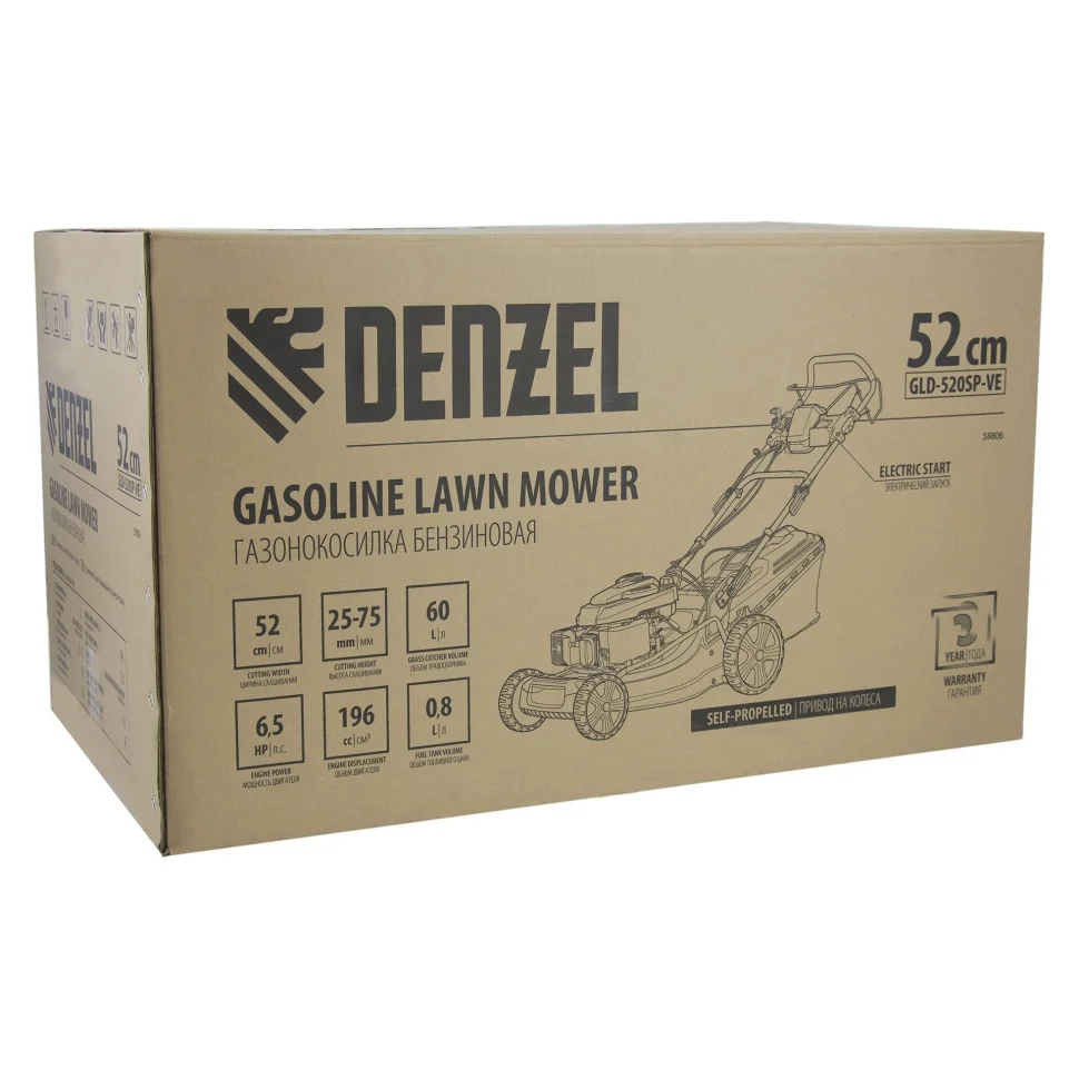 Газонокосилка бензиновая GLD-520SP-VE, 196 см3, ширина 52 см, привод, вариатор, электрический старт, 60 л Denzel 58806
