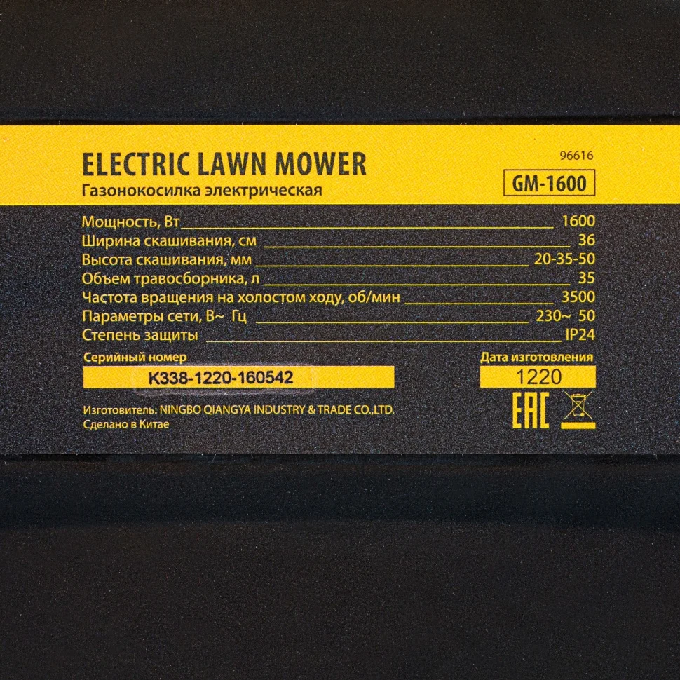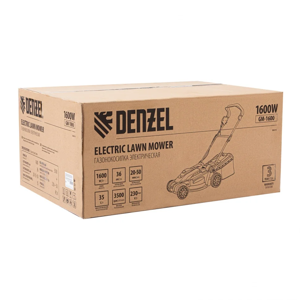 Электрическая газонокосилка Denzel GM-1600 96665 с 3 уровнями скашивания и травосборником на 35 л — маневренная и простая в управлении техника, обеспечивающая ширину скашивания 96 см. Быстро справляется с работой на небольшом участке площадью примерно 4 сотки, помогает оформлять аккуратный газон на дачном участке. Для достижения наилучшего результата предусмотрено 3 уровня скашивания травы: 20 мм, 35 мм и 50 мм.Косилка не требует особых навыков и сложного технического обслуживания — не нужно менять масло и свечи, заливать и сливать бензин, долго заводить и прогревать двигатель. Электродвигатель мощностью 1600 Вт работает тихо и без вредных выхлопов, он экологичен и экономичен.ПреимуществаКомфортная эксплуатация — управление с помощью скобы позволяет держать руки в любом месте рукоятки, также допускается управление одной рукой.Комбинированный травосборник — емкость на 35 л из прочного РР пластика и мягкого сетчатого материала легко очищать, а также удобно хранить в сложенном виде.Индикация заполнения травосборника — по положению флажка-указателя легко определить, когда пора освободить емкость от скошенной травы.Маневренность — широкие колеса позволяют удобно перемещать газонокосилку по участку и не приминают траву.Складная ручка — благодаря эксцентриковым зажимам рукоятку можно быстро разложить для работы или сложить для хранения и транспортировки.Антивибрационное покрытие — мягкая вспененная резина, которой покрыта ручка, гасит вибрации и повышает удобство работы.Рукоятка на корпусе — газонокосилку удобно перемещать и загружать в машину для транспортировки.Небольшой вес 11,5 кг — с газонокосилкой справится даже пожилой человек.Ремонтопригодность — газонокосилка оснащена ременной передачей, что облегчает ее техническое обслуживание.Защита от перегрева — при превышении допустимой температуры срабатывает предохранитель, исключающий выход мотора из строя.Защита по току — газонокосилка работает корректно без риска перегрузки, что позволяет увеличить срок ее службы.Защита сети — конденсатор предохраняет электросеть от помех при запуске косилки.Безопасность — центробежный тормоз мгновенно останавливает вращающийся нож, что особенно важно в экстренных ситуациях.Надежная трансмиссия — благодаря ременной передаче и ударопрочному корпусу двигатель не повреждается при резких остановках и ударах о препятствия.Нужный нож всегда в наличии — Вы не потеряете много времени на поиск режущего полотна для замены, поскольку нужный нож всегда есть в наличии на нашем сайте.Гарантия 3 года — высокое качество техники Denzel подтверждено производителем.