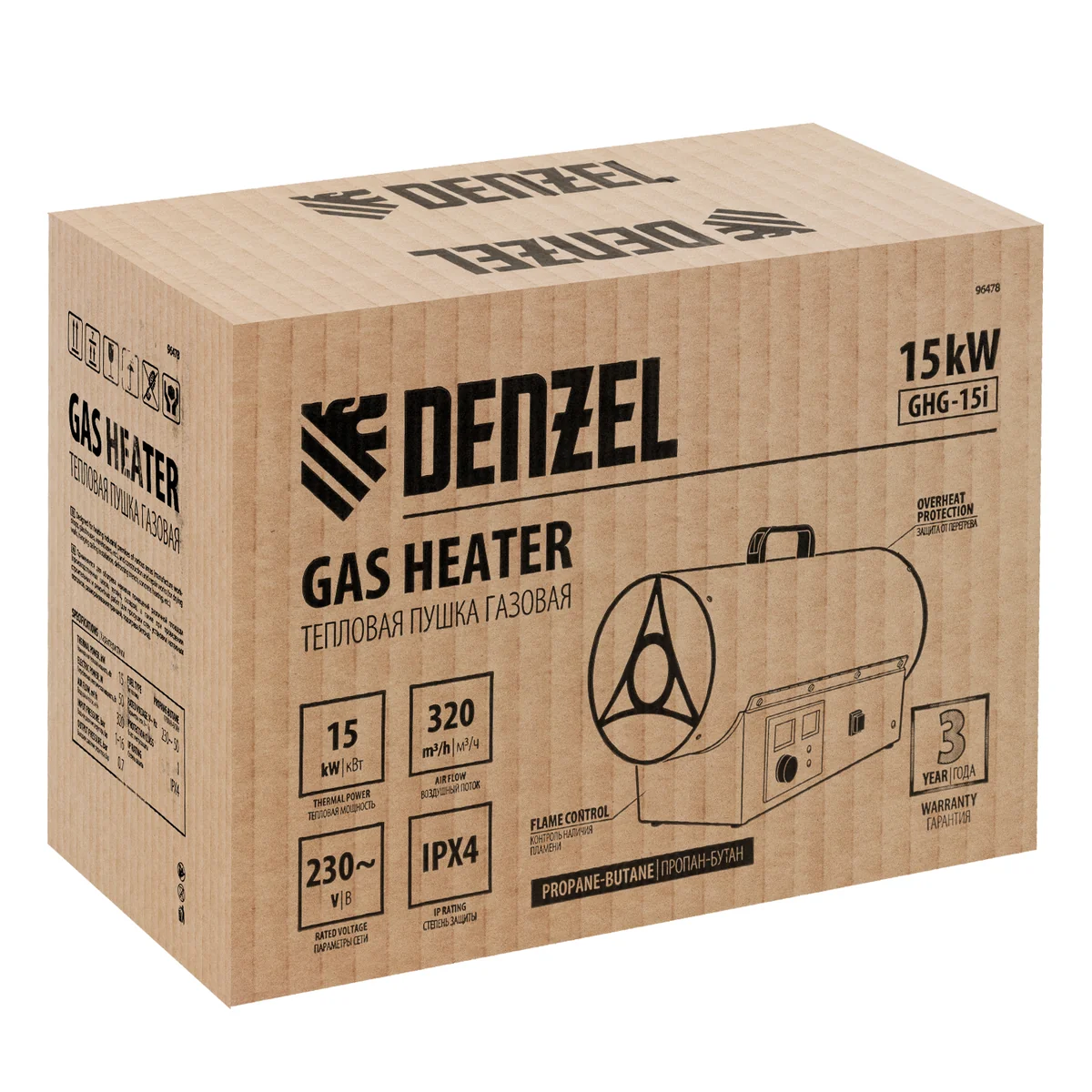 Газовая тепловая пушка Denzel GHG-15i 96478 мощностью 15 кВт, с цифровым термостатом и двойным электромагнитным клапаном, работает на сжиженном газе пропан-бутан и предназначена для обогрева хорошо вентилируемых нежилых помещений площадью до 150 кв. м: складов, цехов, гаражей, мастерских, теплиц. Генерирует воздушный поток 320 куб. м/ч, поэтому эффективно справляется с поставленными задачами. Используется на строительных и производственных объектах, для монтажа натяжных потолков.ПреимуществаЦифровой термостат — если температура в помещении становится ниже заданной, пушка включается автоматически для точного поддержания выставленных значений.Электронный поджиг — при выставлении температуры выше комнатного значения поджиг поисходит автоматически.2 режима работы — пушка может функционировать как вентилятор или обогреватель.Термозащита — пушка отключается при перегреве, что предотвращает ее поломку.Встроенная система безопасности — специальный датчик отключает подачу газа в случае затухания пламени.Удобный контроль рабочих параметров — на LED-дисплее отображается установленная температура и температура в помещении.Экономичность — расход газа составляет 0,93 кг/ч, поэтому часто менять баллон не требуется.Удобное перемещение — пушка весит 4,1 кг, в верхней части корпуса предусмотрена специальная ручка.Подтвержденное качество — на устройство действует гарантия 3 года.