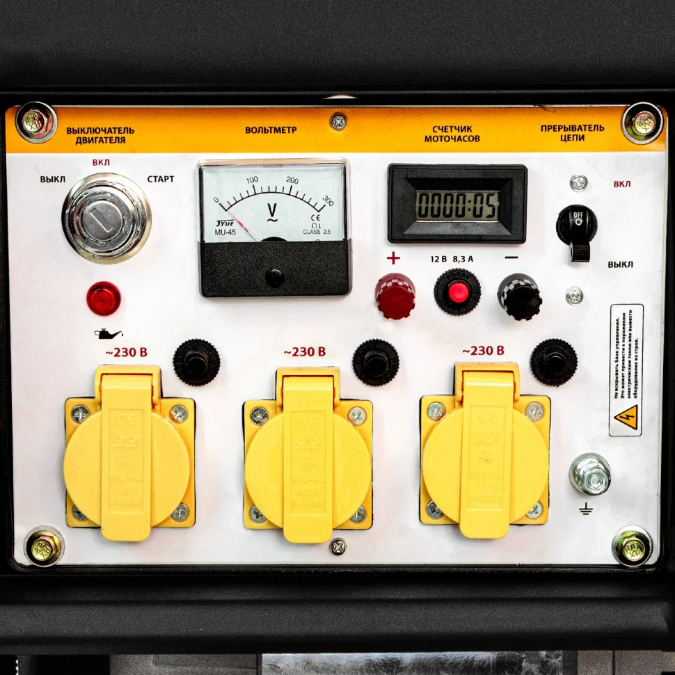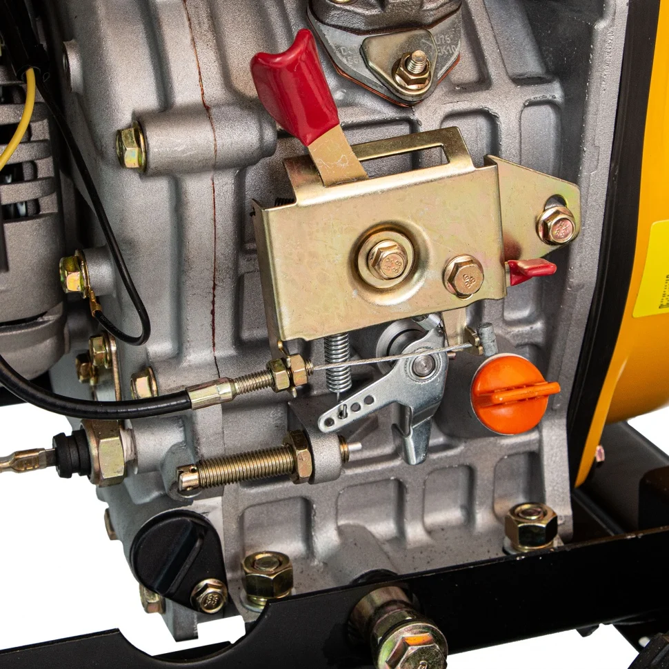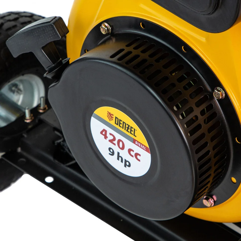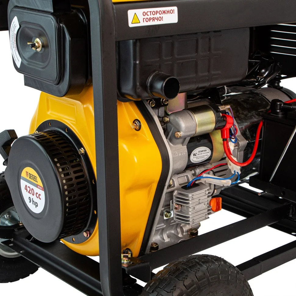 Дизельный генератор Denzel DD6300Е 94657 мощностью 5,0 кВт, 230 В / 50 Гц, с баком объемом 15 л и электростартером, предназначен для снабжения электричеством дачи, садового участка, строительной площадки, мастерской, магазина. Например, к нему можно одновременно подключить телевизор, холодильник, утюг, микроволновку, 3 лампы накаливания. Дизельный генератор потребляет меньше топлива, чем аналогичный по мощности бензиновый — бака объемом 15 л хватит на 10 часов работы.ПреимуществаНадежные комплектующие — металлический коленвал и распредвал, альтернатор с медной обмоткой, чугунная гильза, цилиндр и картер из алюминиевого сплава прослужат долго.Высокий ресурс поршневой группы — генератор не запустится при низком уровне масла.Защита двигателя — встроенная система безопасности автоматически отключает генератор при коротком замыкании и перегрузке.Работа без скачков напряжения — благодаря блоку AVR к генератору можно подключать чувствительную технику.Безопасная эксплуатация — каждая розетка оборудована индивидуальным предохранителем.Легкий старт — запуск двигателя производится простым поворотом ключа, положение воздушной заслонки регулируется автоматически.Холодный запуск — благодаря ручному стартеру двигатель быстро заведется даже при низкой температуре.Удобный контроль работы — счетчик моточасов отображает отработанное время, вольтметр позволяет отслеживать напряжение в сети, а индикатор топлива помогает своевременно заправлять бак.Зарядка автомобильных аккумуляторов — на панели управления предусмотрены специальные разъемы 12 В.Комфортная транспортировка — колеса и ручки входят в комплект.Подтвержденное качество — производитель предоставляет 3-летнюю гарантию на заводской брак.