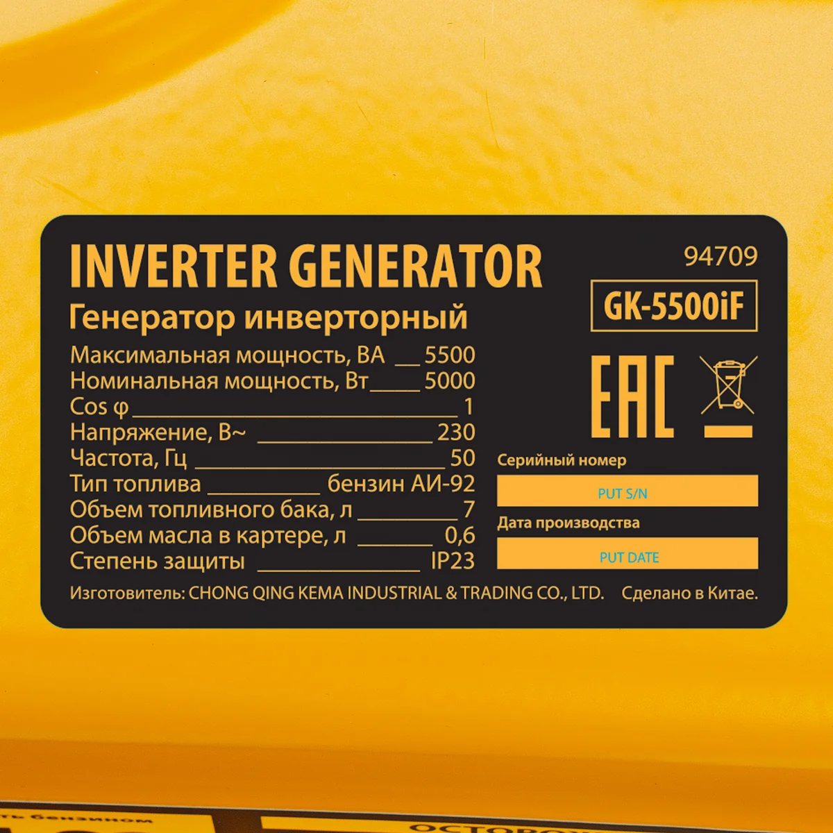 Генератор инверторный GK-5500iF, 5,5 кВт, 230 В, ручной старт DENZEL 94709