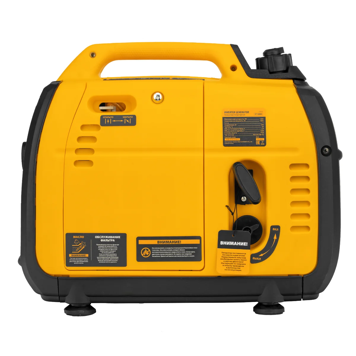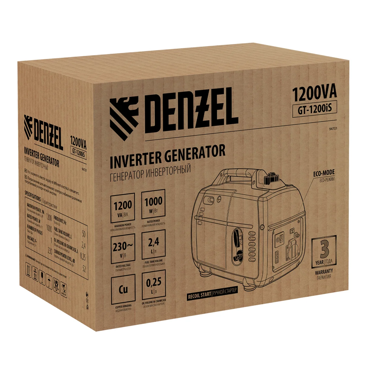 Инверторный генератор Denzel GT-1200iS 94701 мощностью 1,2 кВт, в закрытом корпусе, с ручным стартом, — самый компактный, легкий и экономичный в своей линейке, с ним легко справится даже неопытный пользователь. Идеально подходит для выездов на природу и рыбалку, также будет незаменим на дачном участке и в торговой палатке. Четырехтактный двигатель мощностью 1,8 л.с. и объемом 53,5 куб. см работает стабильно и имеет небольшой уровень шума 52 дБ.