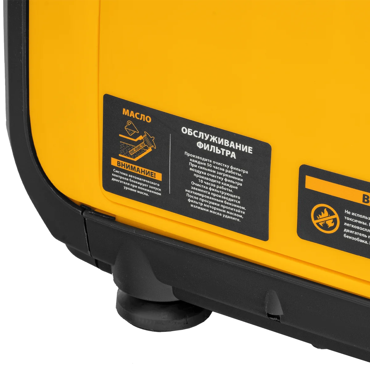 - Визуальный контроль — индикаторы на передней панели информируют о работе генератора, недостаточном уровне масла и о перегрузке.