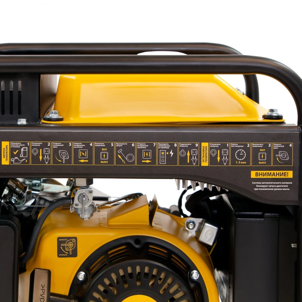 - Визуальный контроль — индикаторы на передней панели информируют о работе генератора, недостаточном уровне топлива и о перегрузке.