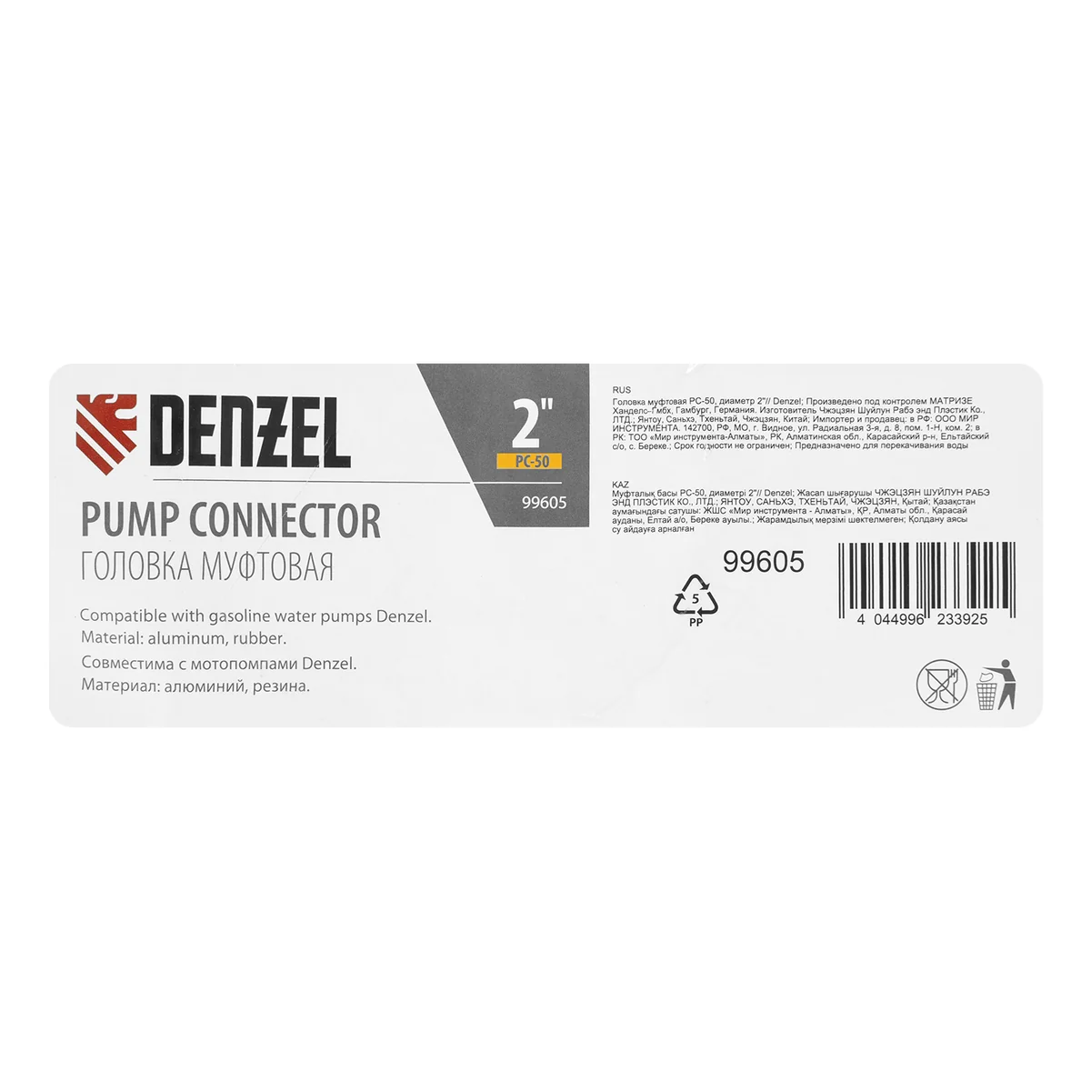 Муфтовая головка Denzel PC-50 99605 с присоединительным диаметром 2"" предназначена для соединения выходного патрубка мотопомпы с напорным рукавом. Подходит к моделям Denzel 99201 и 99203. Используется для организации систем полива, водоснабжения, пожаротушения.ПреимуществаАксессуар изготовлен из алюминия, устойчивого к образованию коррозии.Резиновая манжета повышает герметичность соединения.Благодаря быстроразъемному соединению установка головки занимает несколько секунд.