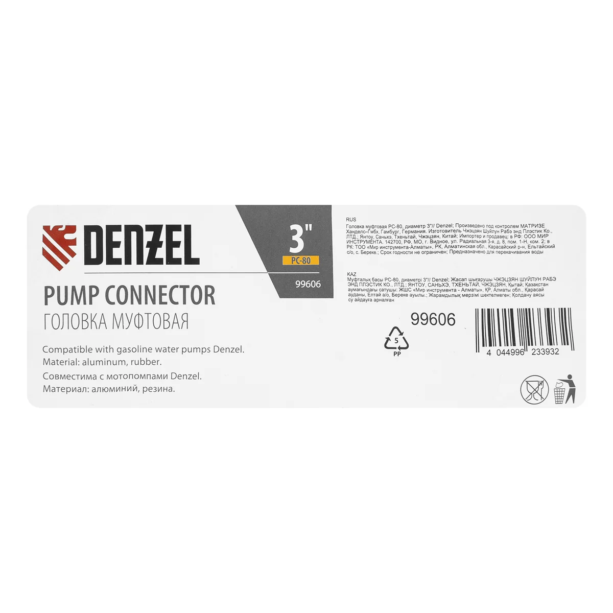 Муфтовая головка Denzel PC-80 99606 с присоединительным диаметром 3"" предназначена для соединения выходного патрубка мотопомпы с напорным рукавом. Подходит к моделям Denzel 99202 и 99204. Используется для организации систем полива, водоснабжения, пожаротушения.ПреимуществаАксессуар изготовлен из алюминия, устойчивого к образованию коррозии.Резиновая манжета повышает герметичность соединения.Благодаря быстроразъемному соединению установка головки занимает несколько секунд.