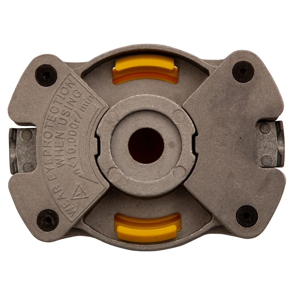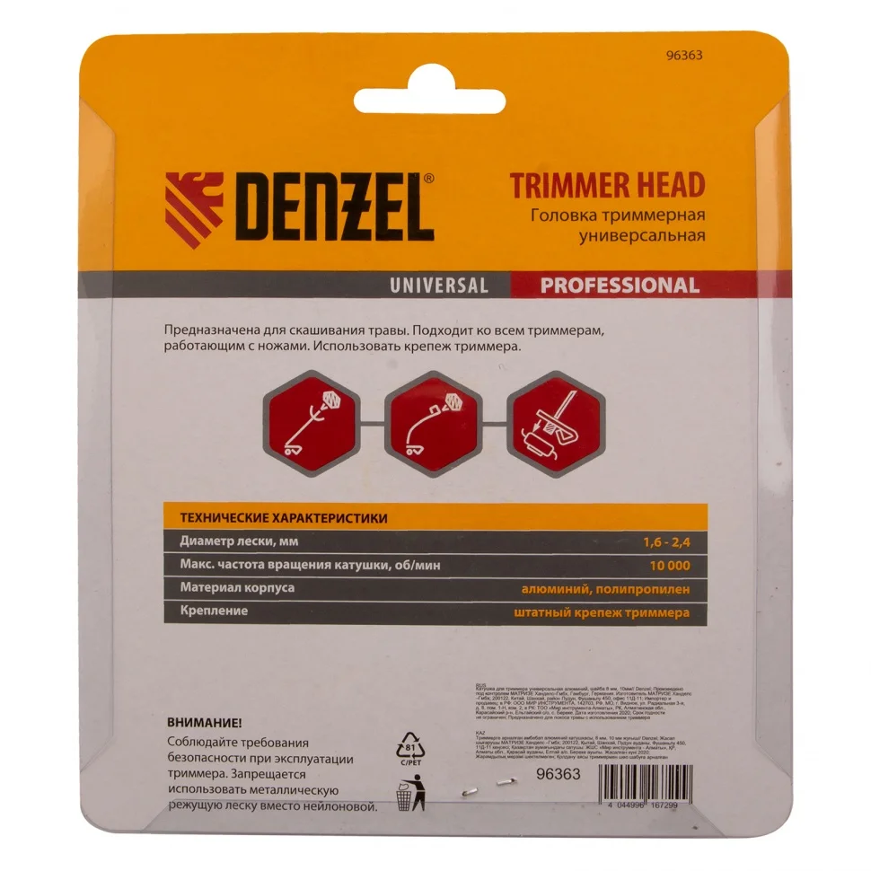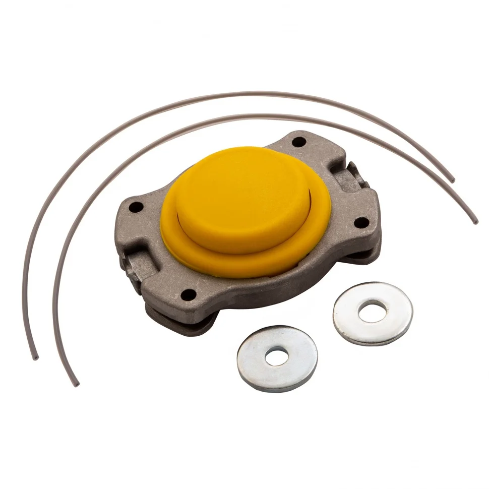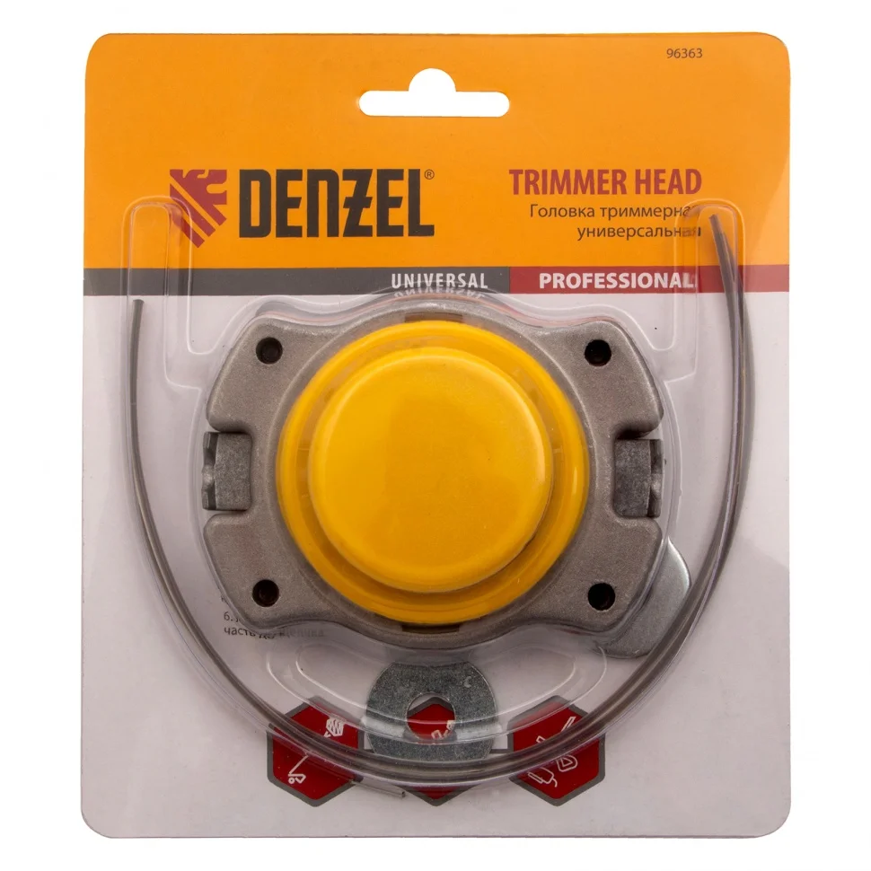 Триммерная головка Denzel 96363 с универсальным креплением стыкуется с большинством марок электро- и бензокос. Толщина режущей лески 2,4 мм позволяет быстро скашивать газон и в несколько этапов срезать траву выше 20 см. Преимущества:Головка работает с небольшими отрезками лески, поэтому они не путаются и не перегреваются даже при высокой нагрузке.Два пружинных фиксатора делают заправку лески простой и удобной.Конструкция головки сделана компактной, но прочной благодаря алюминиевому корпусу.Для установки головки используется штатный крепеж триммера, также комплект поставки дополнен крепежом в виде шайб М8 и М10.