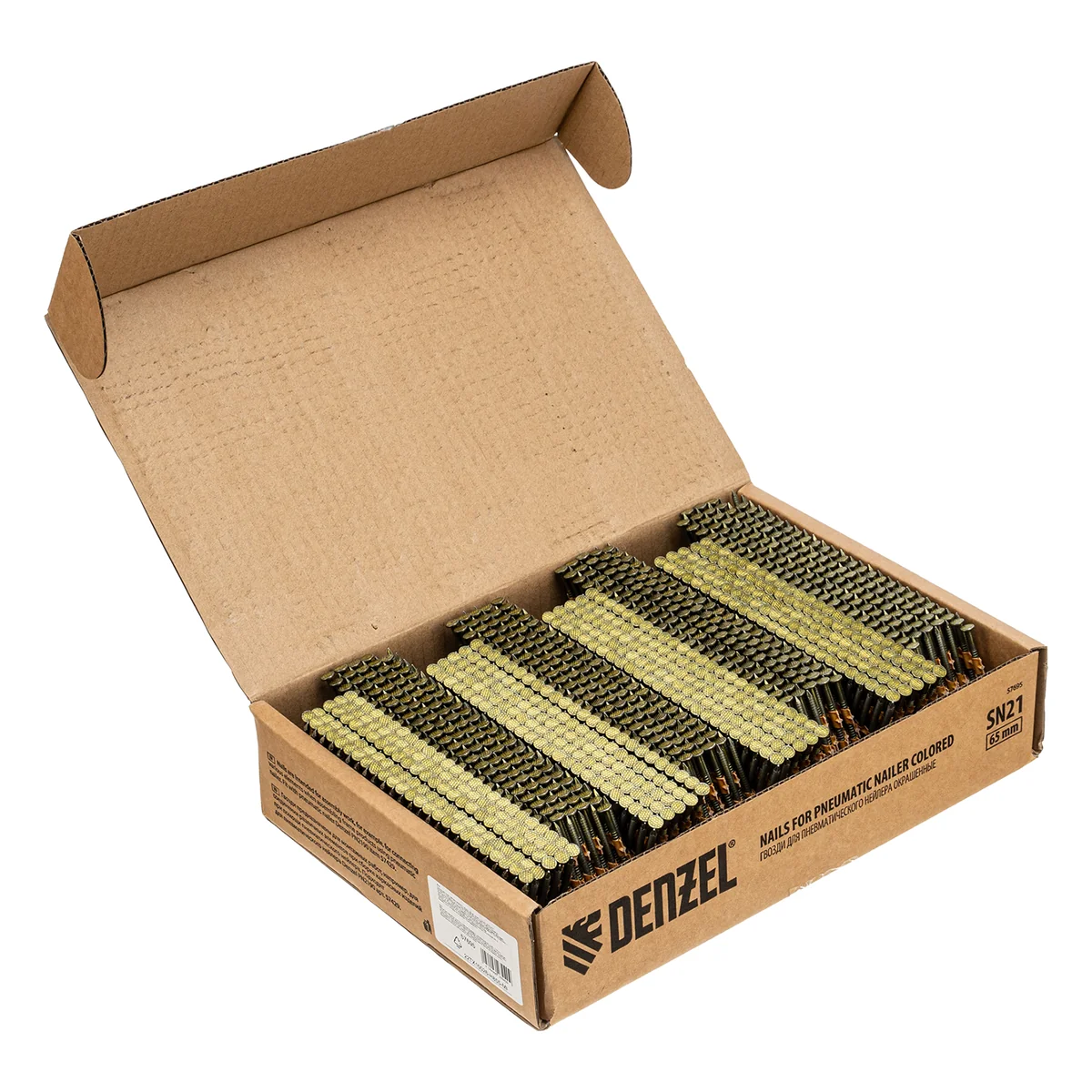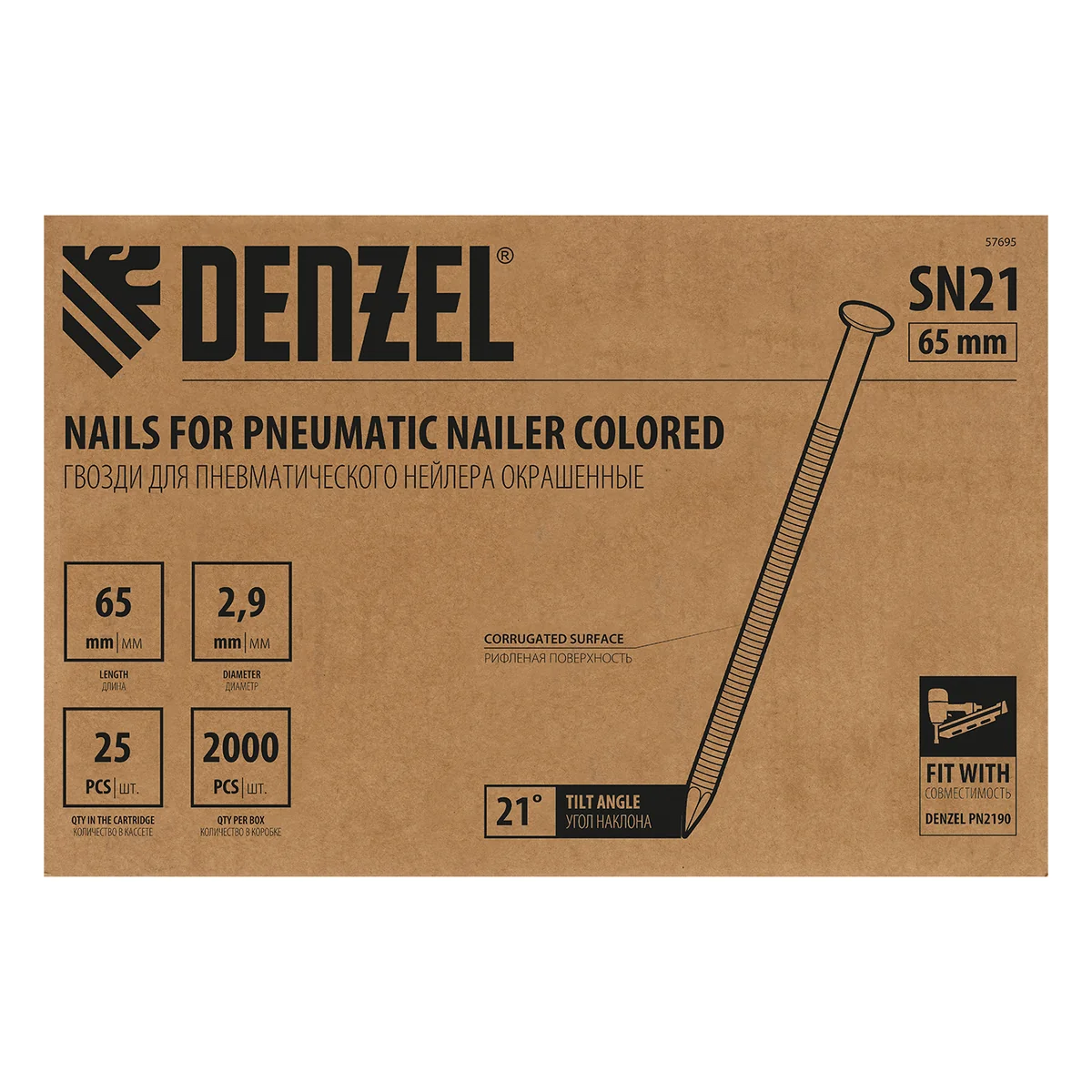 Гвозди Denzel 57695 типа SN21, длиной 65 мм и диаметром 2,9 мм, с крашеной поверхностью, 2000 шт. в упаковке, — расходники для пневматического нейлера. Используются для скрепления различных материалов, будут полезны во время сборочных и отделочных работ.ПреимуществаПрочность — крепежные элементы изготовлены из стали.Надежное и долговечное соединение — гвозди не гнутся, рифленая рабочая часть исключает их самопроизвольный выход из своих гнезд.Удобная комплектация — запаса из 2000 шт. хватит для выполнения большого объема работ.