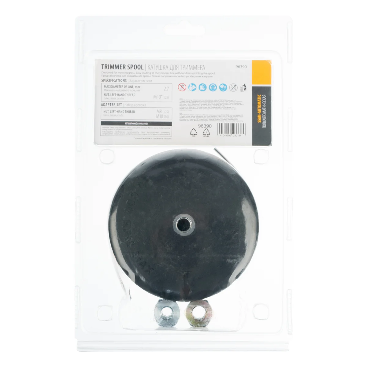 Полуавтоматическая триммерная катушка Denzel 96390 с легкой заправкой лески крепится на вал триммера при помощи гайки М10 с левой резьбой и шагом 1,25 мм, дополнительно комплектуется гайками М8 и М10 с шагом 1,25 и 1,0 мм соответственно. Заправляется леской диаметром до 2,7 мм, устанавливается на вал бензо- или электротриммера и используется для скашивания газонной травы, а также для удаления сорняков.ПреимуществаБыстрое обновление лески — для удлинения корда достаточно слегка ударить катушкой по земле, не выключая триммер.Универсальность — в комплект поставки входят гайки разных типоразмеров для установки катушки на триммеры с различными типами крепления.Легкая заправка лески — разбирать катушку не требуется, это значительно экономит время пользователя.